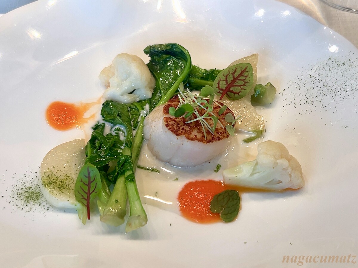 カルダモン、レモングラス、ヨーグルト、パプリカピューレなどが載り、それらを併せてカレーのような風味を味わえる。