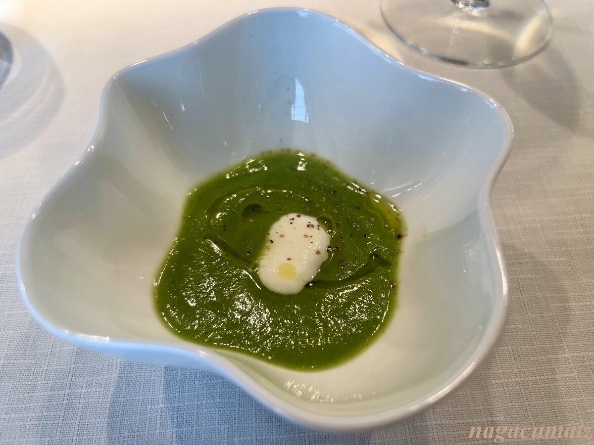 ブロッコリースープには、ミントとハラペーニョも入り、ヨーグルトが載る。