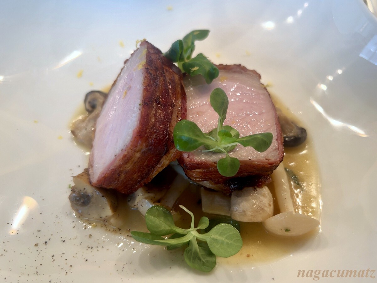 スズキかポークの選択で、ポークを。ポークはベーコンが巻かれていて、下には柑橘系の風味のキノコ各種が敷かれている。