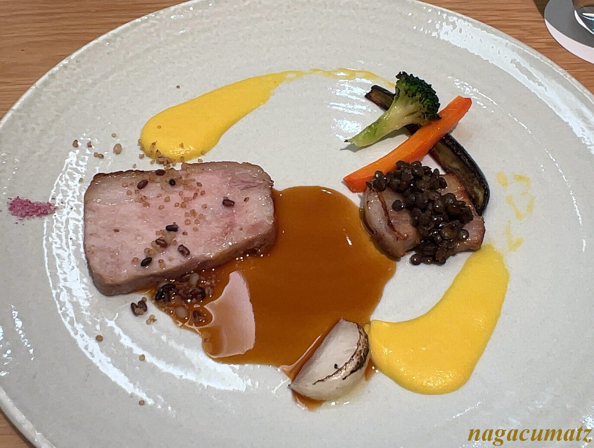 沖縄の金アグー豚 脂身の多い部分が右と2種類食べ比べられる。黄色は人参のピューレ。レンズ豆などと共に。