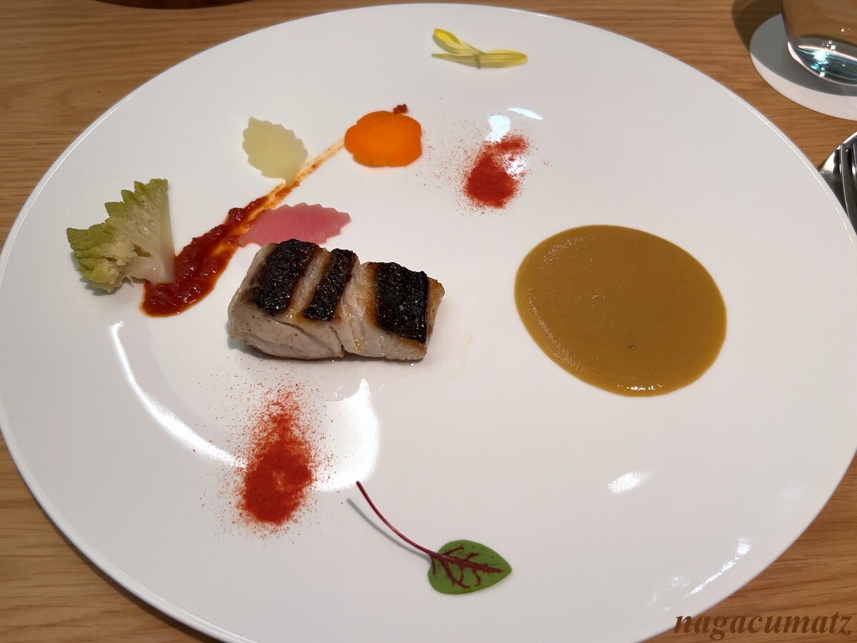 静岡の目鯛 西洋ヨモギのピューレと、トマトのピューレが付く。