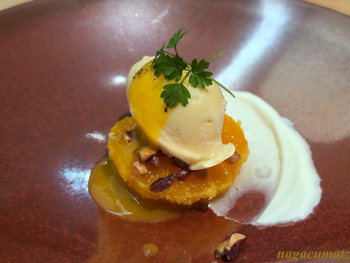 パティシエのインスピレーション「蜜柑」 上にはバニラアイスクリーム、右にはマスカルポーネクリームが付く。
