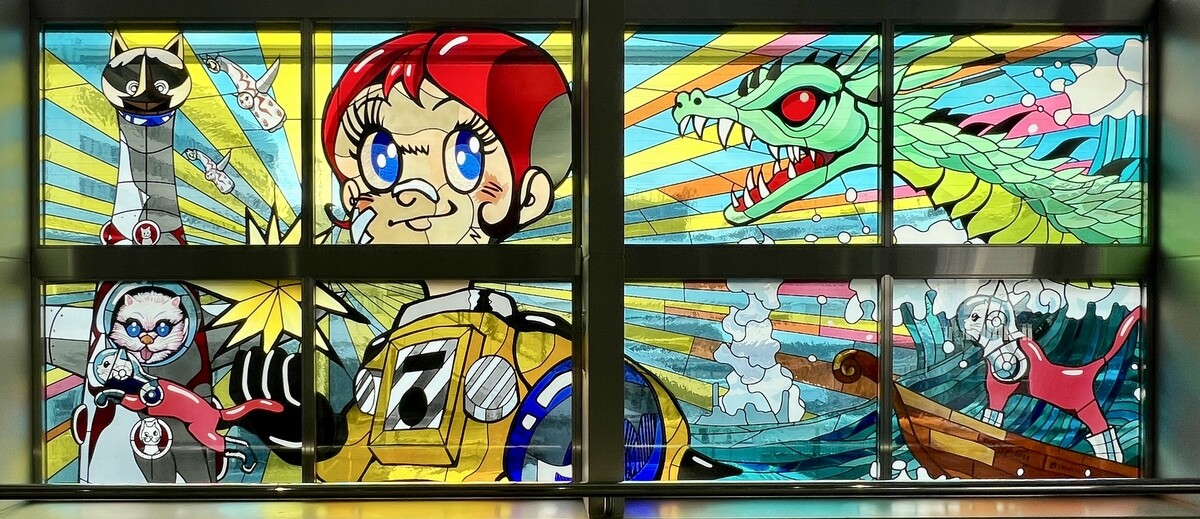 背景には透明感のあるガラスを使用し、キャラクターには不透明なガラスを使用。不透明なガラスの中には、あえて透明なガラスに研磨剤を吹き付けるなどして(サンドブラスト)ガラスの表面をすりガラス状にしたものもあり、キャラクターの輪郭線も、太く描くキャラクターとそうでないキャラクターを描き分けることで、遠近感を表現しづらいステンドグラスでのチャレンジとされたのだとか。