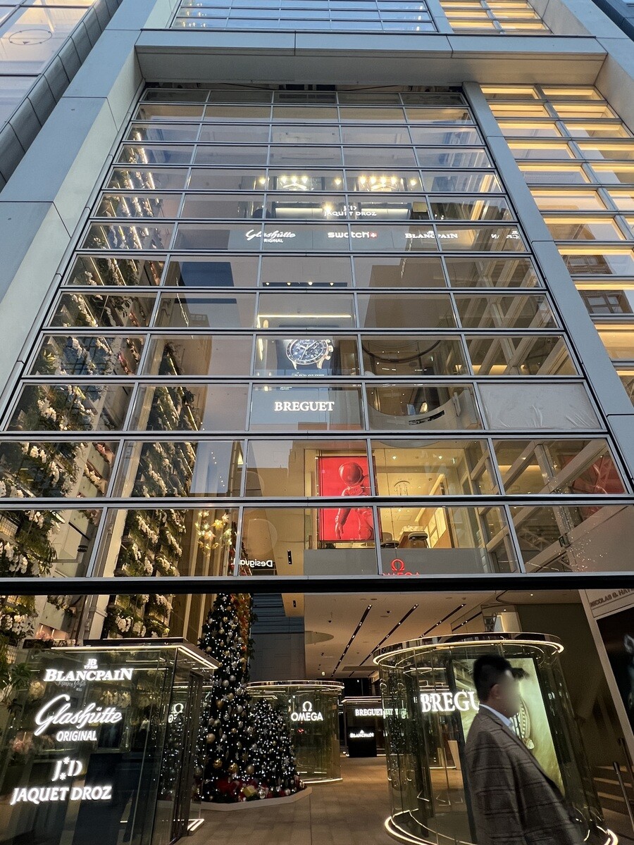 地下1階にスウォッチ旗艦店ブティック、2~4階はスウォッチグループのブランド(ブレゲ・ブランパン・グラスヒュッテオリジナル・ジャケドロー・レオンアト・オメガ),5階以上はカスタマーセンターやオフィス・イベントホールとなっており,ビル全体がスウォッチビルとなっている.
