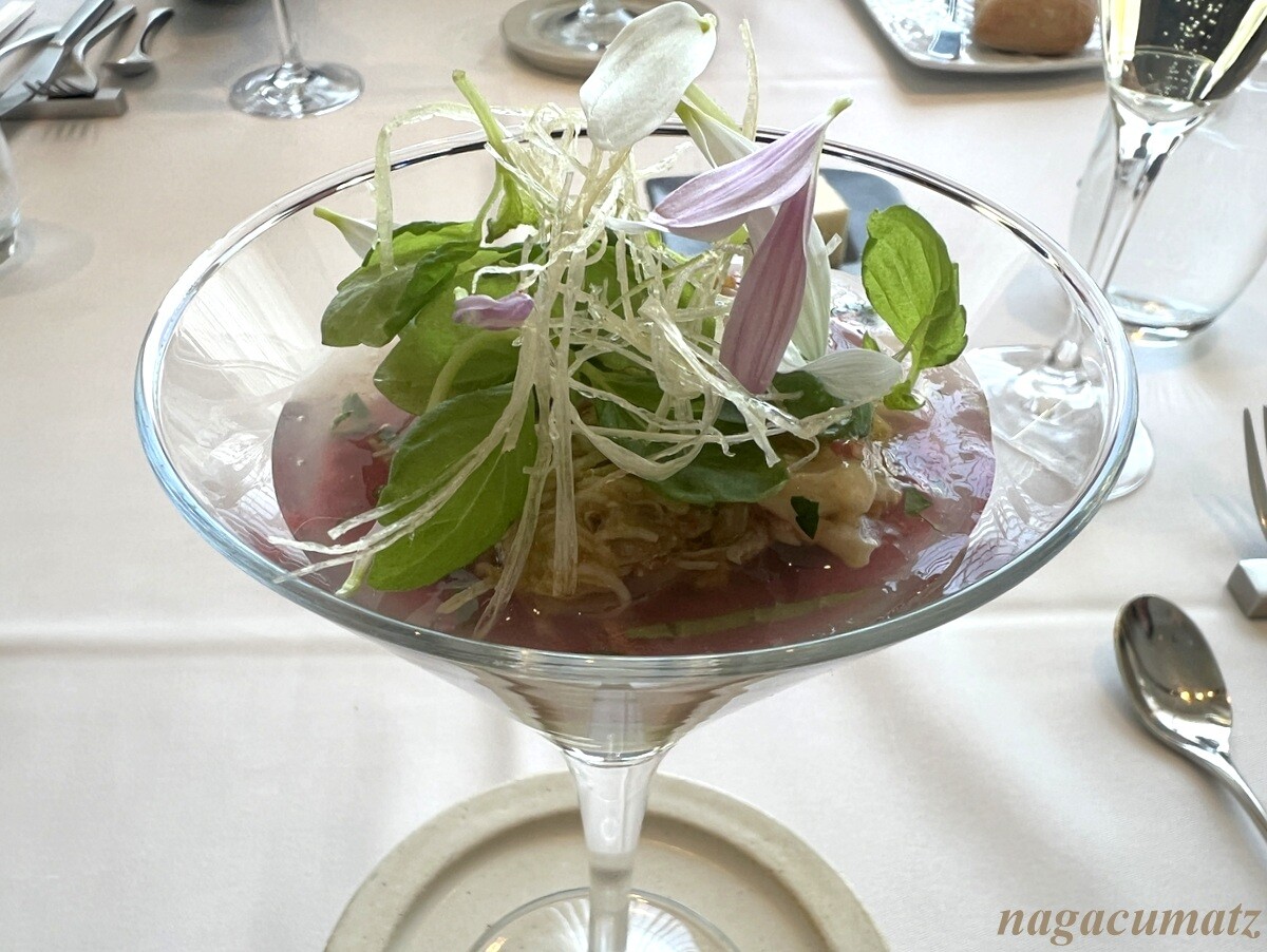 ずわい蟹とビーツのカクテル ビーツのほかに、山芋、きゅうり、アボカドなども入っている。