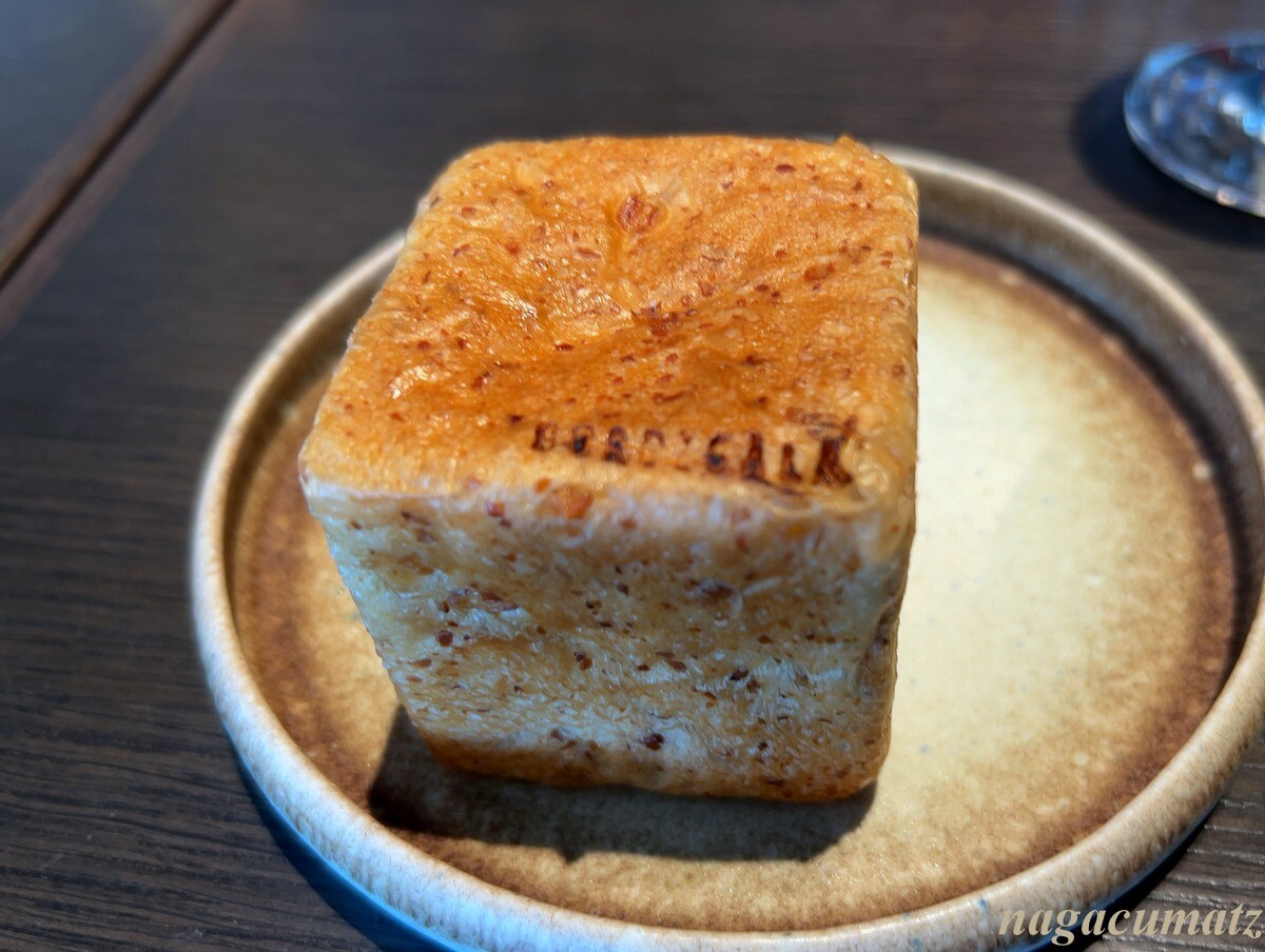 ベーカリーがメインなだけに、屋号が押印されアマニ油の入ったパン、その後バゲットも出て来た。