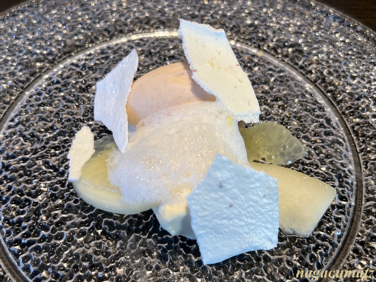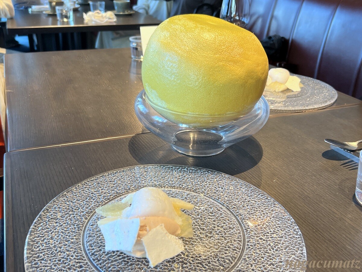 デザート 晩白柚のピールをその場で削って上からかけて下さるのだが、とても良い香り。