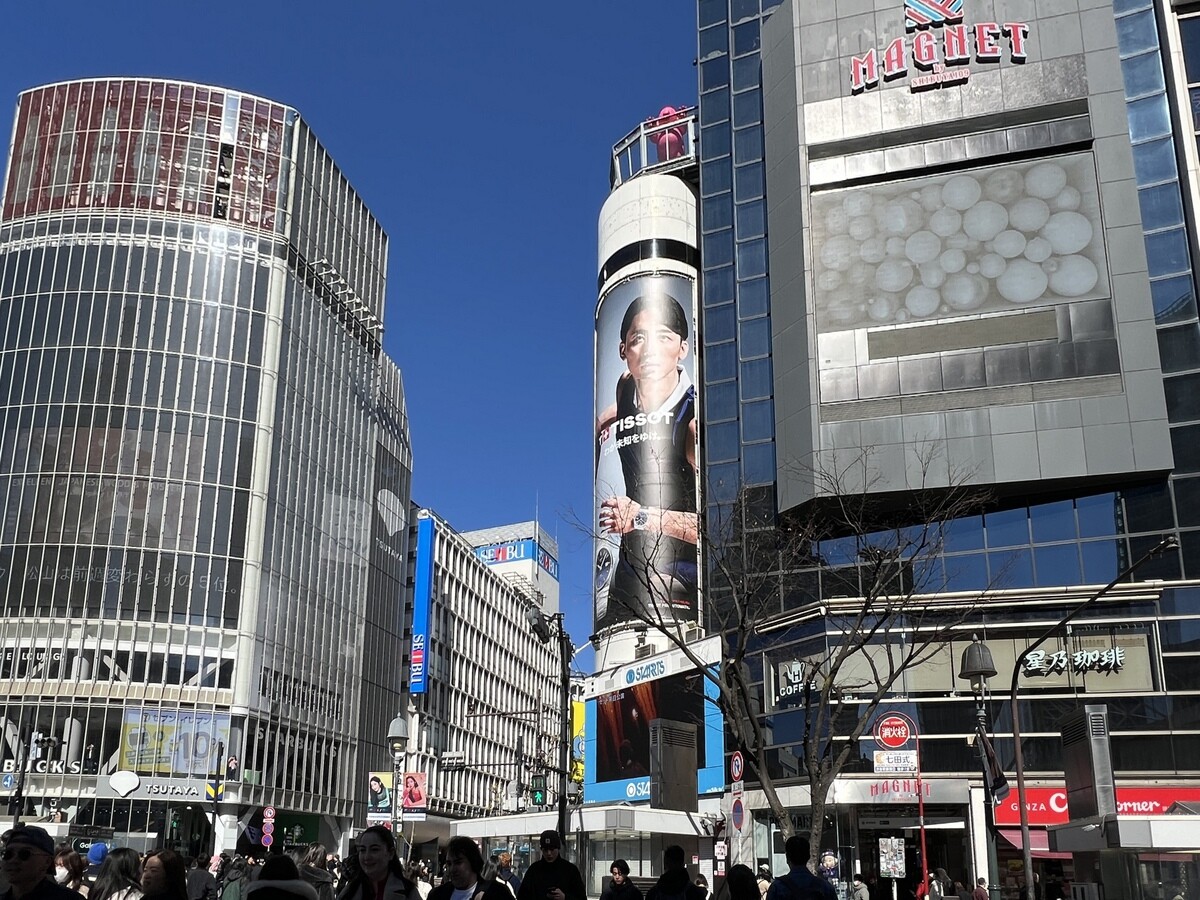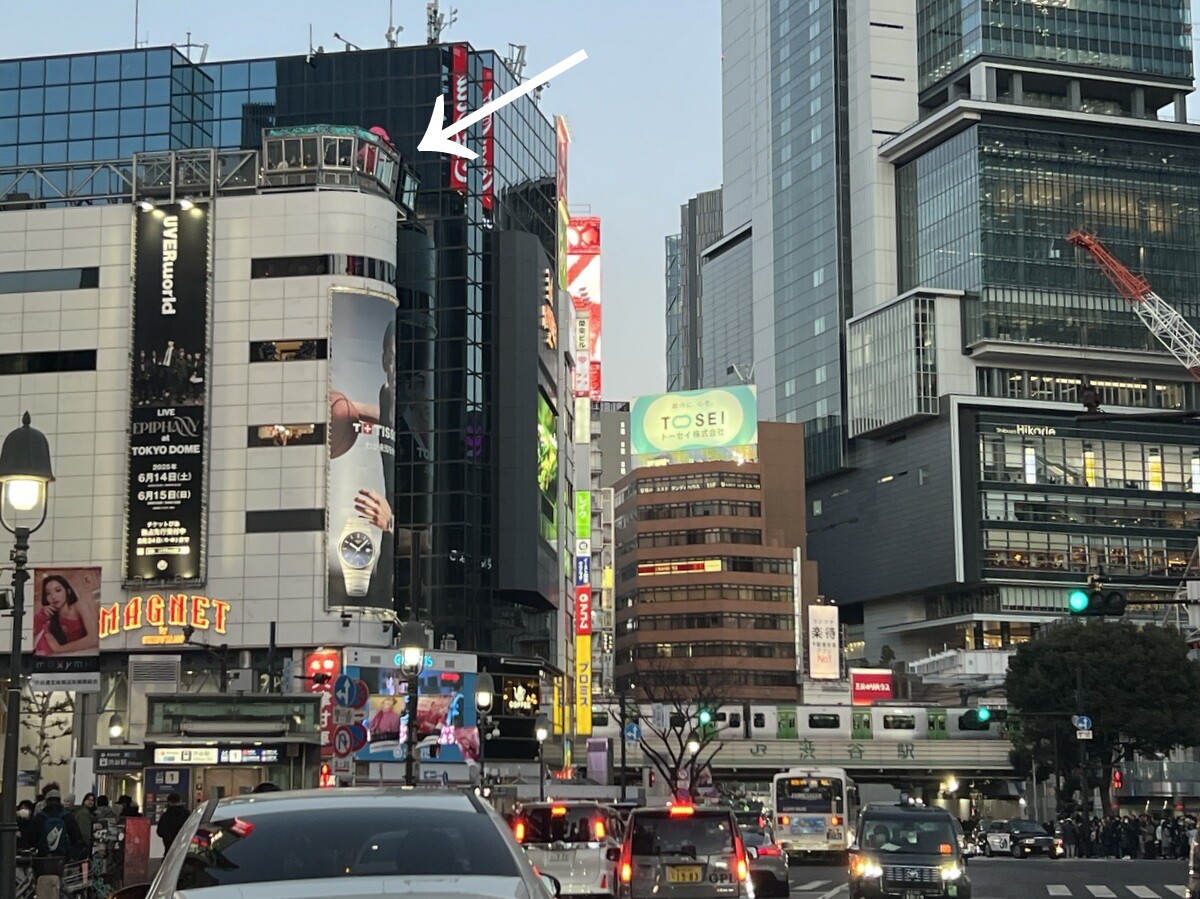 渋谷のスクランブル交差点を上から見下ろしている。