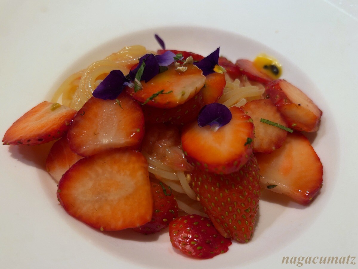 宮城県産の苺「ハナミガキ」、トマト、パッションフルーツの冷製パスタ