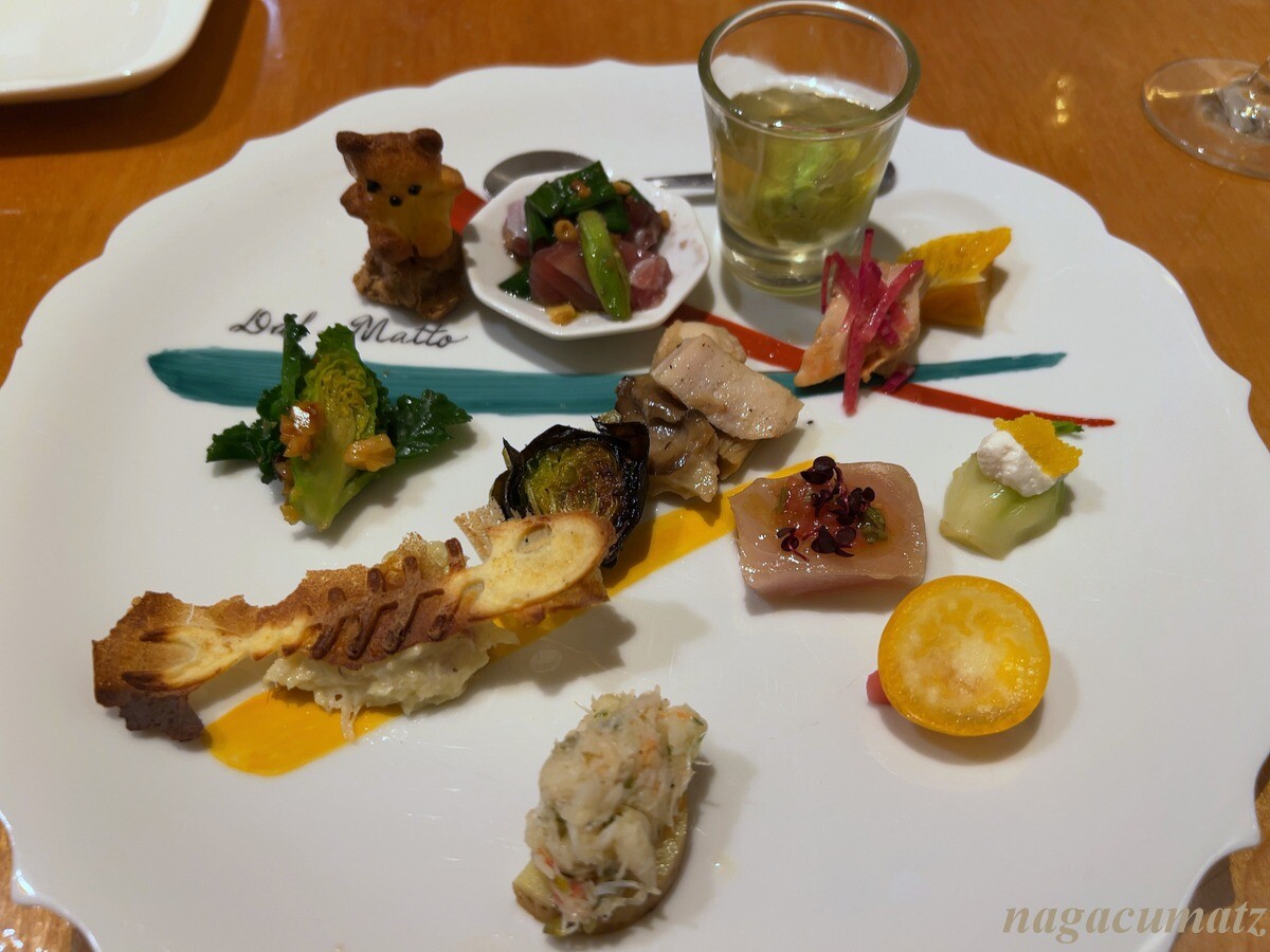 クマの下はクマ肉のテリーヌ、マグロとニラ、枝豆のクリーム?とコンソメジュレ、マンボウと鮑茸、鰤のカルパッチョ、プチベール、ズワイ蟹とキタアカリ、黄色のビーツ、フォアグラ、芽キャベツ などなど。。。