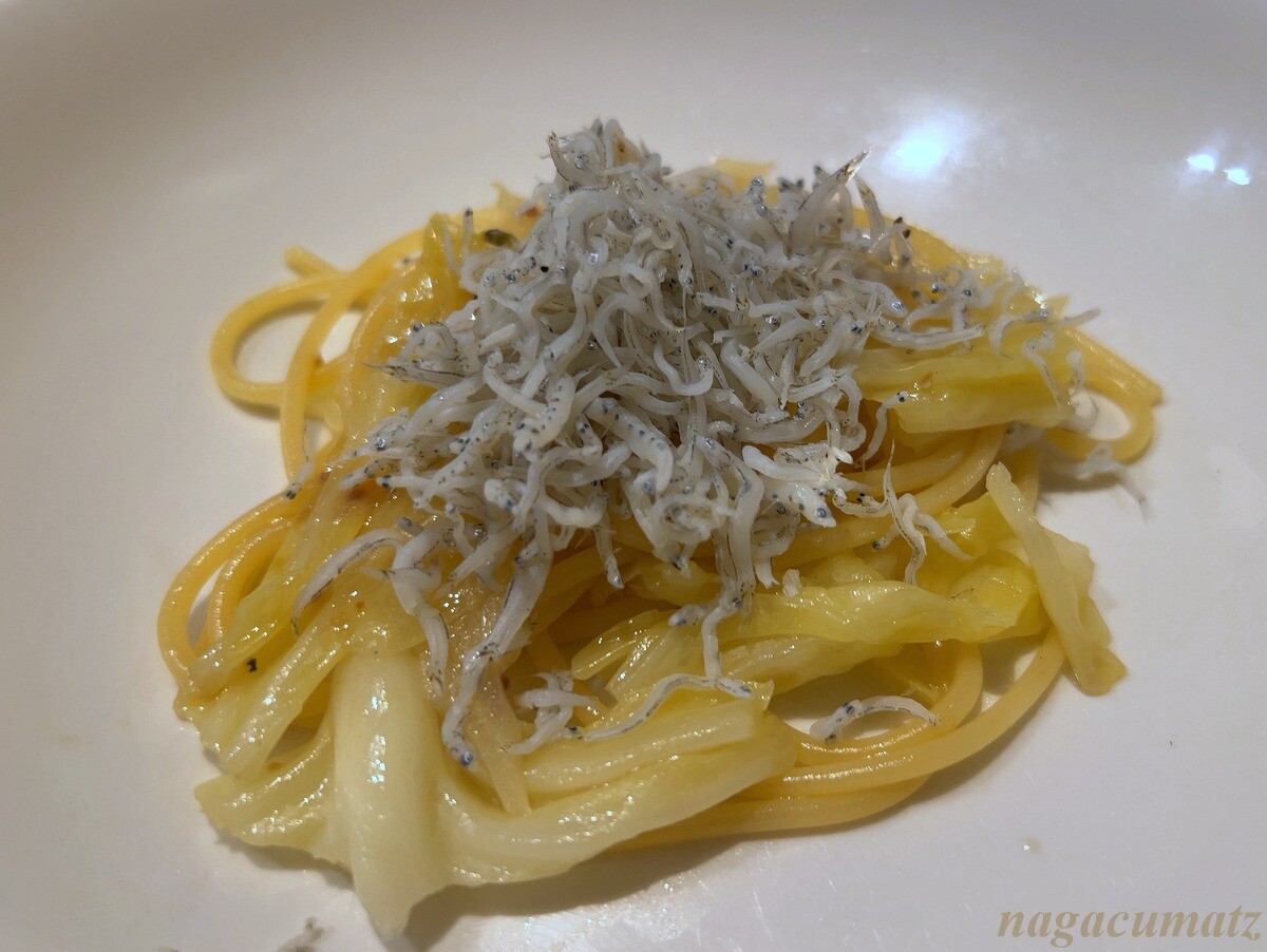パスタの量が選べるので、一番少量を依頼。雪下キャベツ、静岡県産のしらす、アンチョビ。