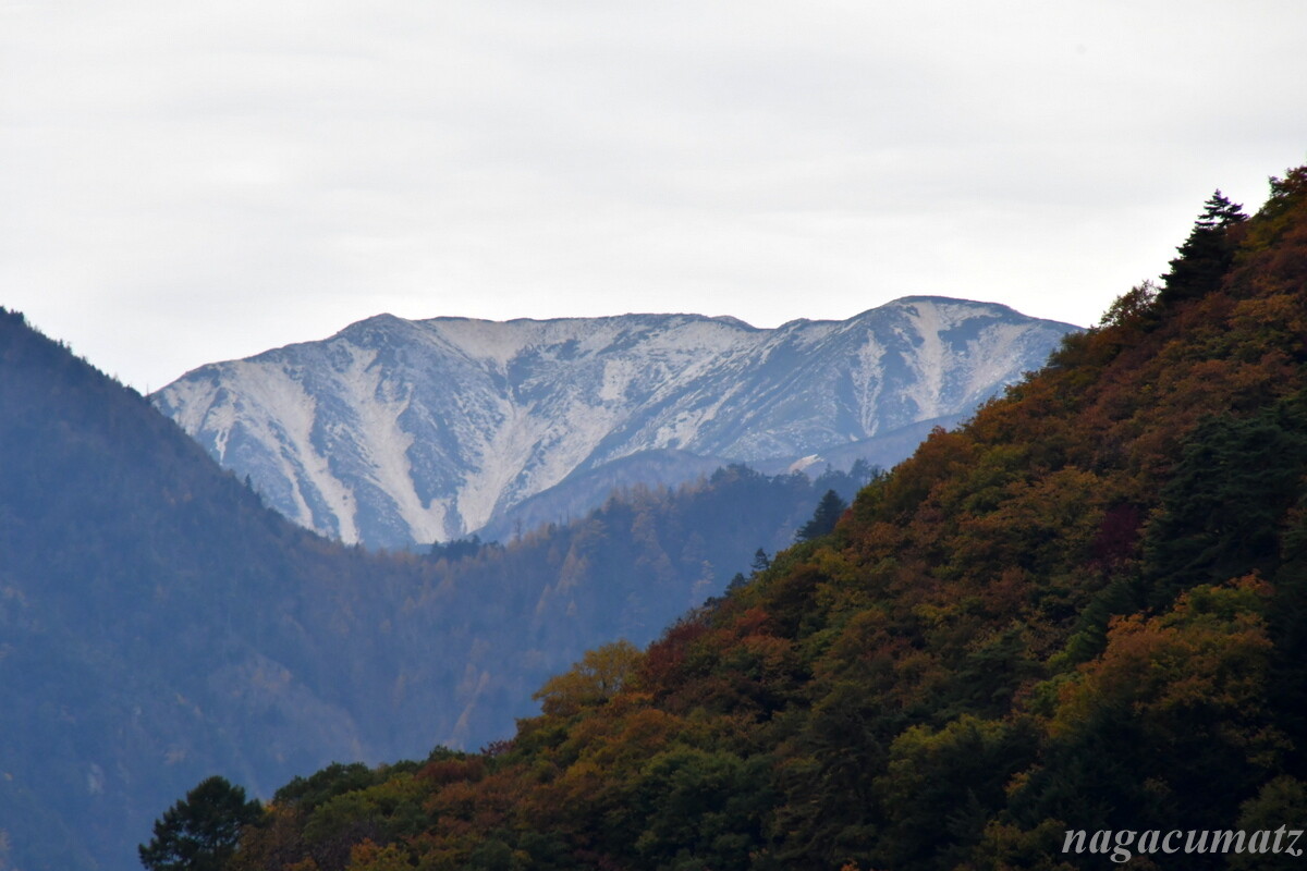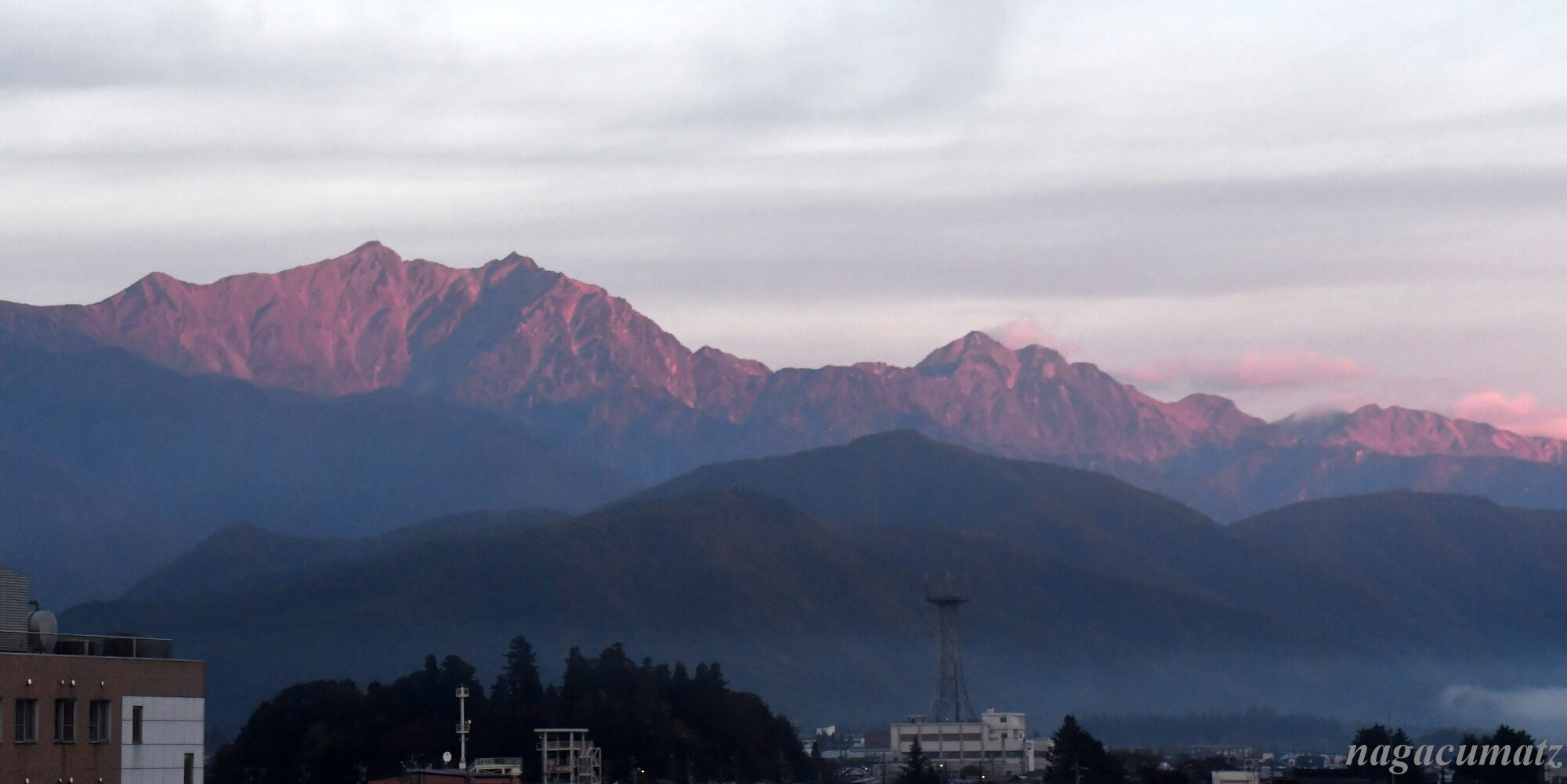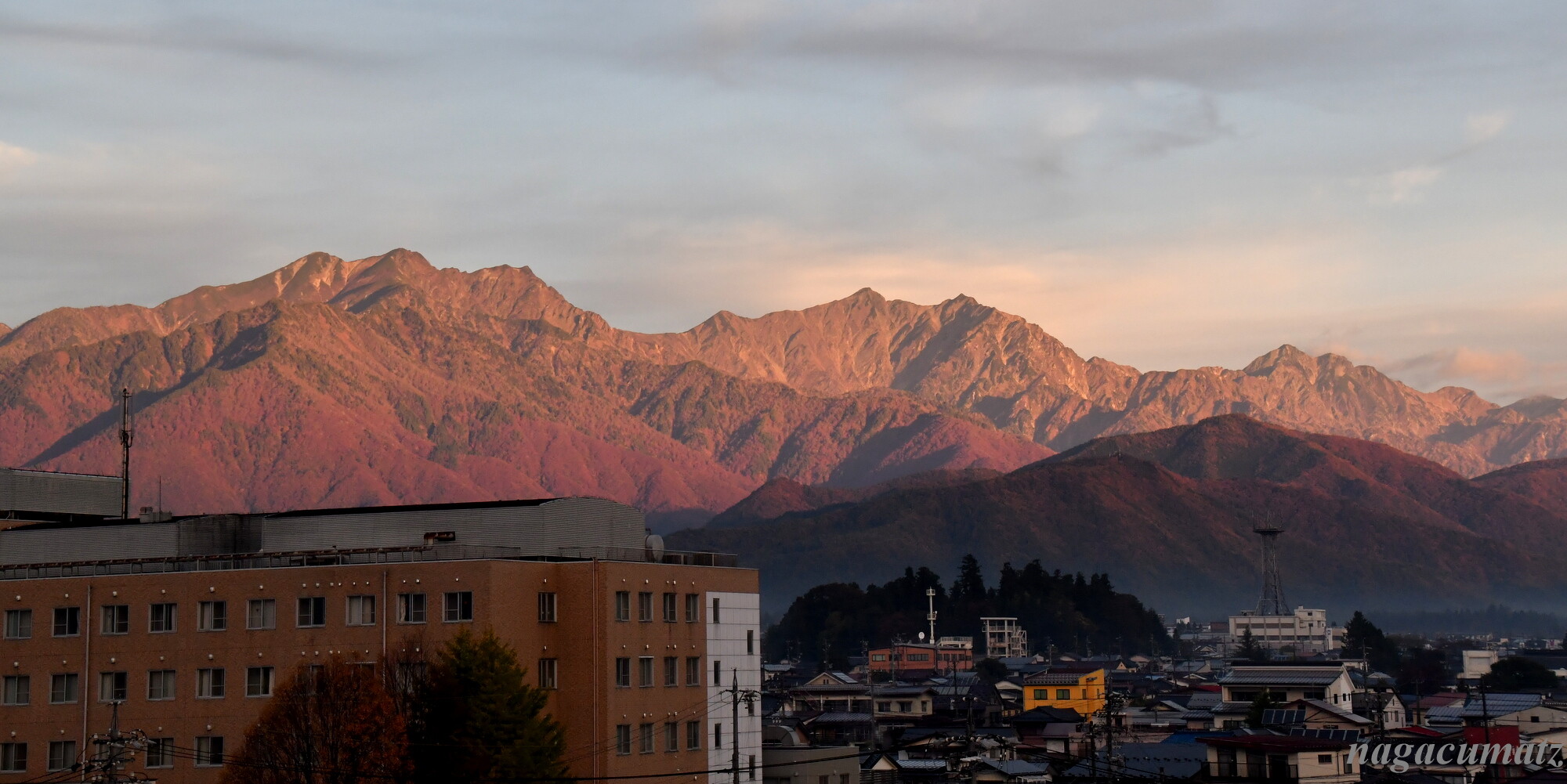 大町で迎えた朝は、朝日に照らされ赤くなった北アルプスの山々を堪能。白馬鑓ヶ岳や杓子岳は既に冠雪していた。