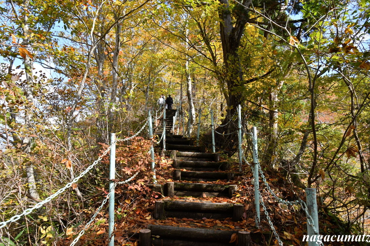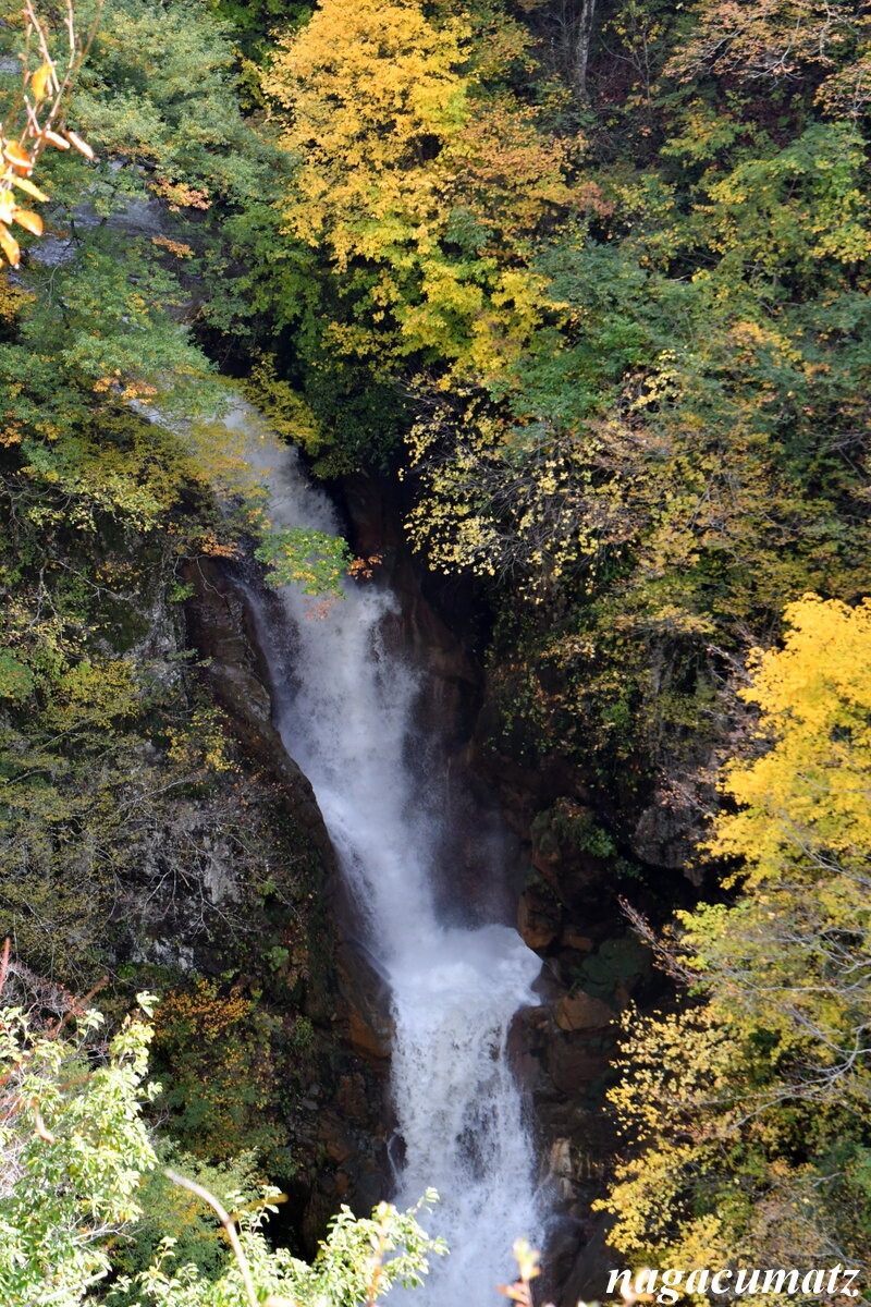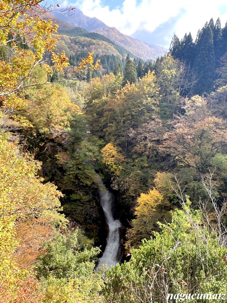 「蛇淵の滝」昔、熊獲り名人が熊を追い、川にかけられた丸太を渡り終えて振り向いたところ、丸太ではなく大蛇だったという逸話から、「蛇淵の滝」と呼ばれるようになったとか。