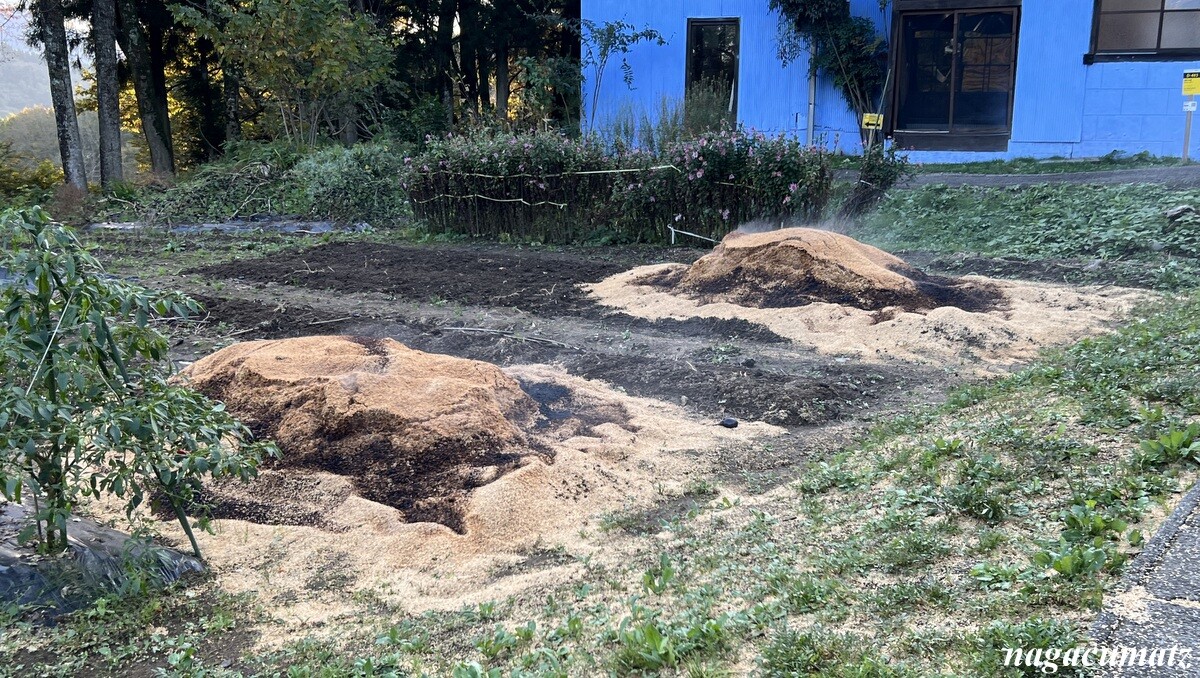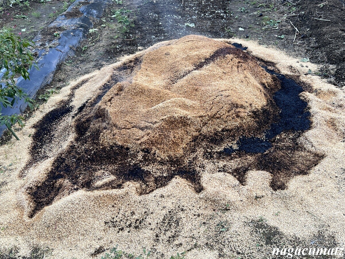 何カ所も、稲刈りを終えた田んぼに、何やらうずたかくなっていて、中には煙突のような筒状の物を山に立てていたりもする。初めて見た光景だったので、お聞きしたところ、籾殻を集めて焼いて、それを肥料にするのだそう。画像のものは煙突は立てていないが、白い煙があがっていた。