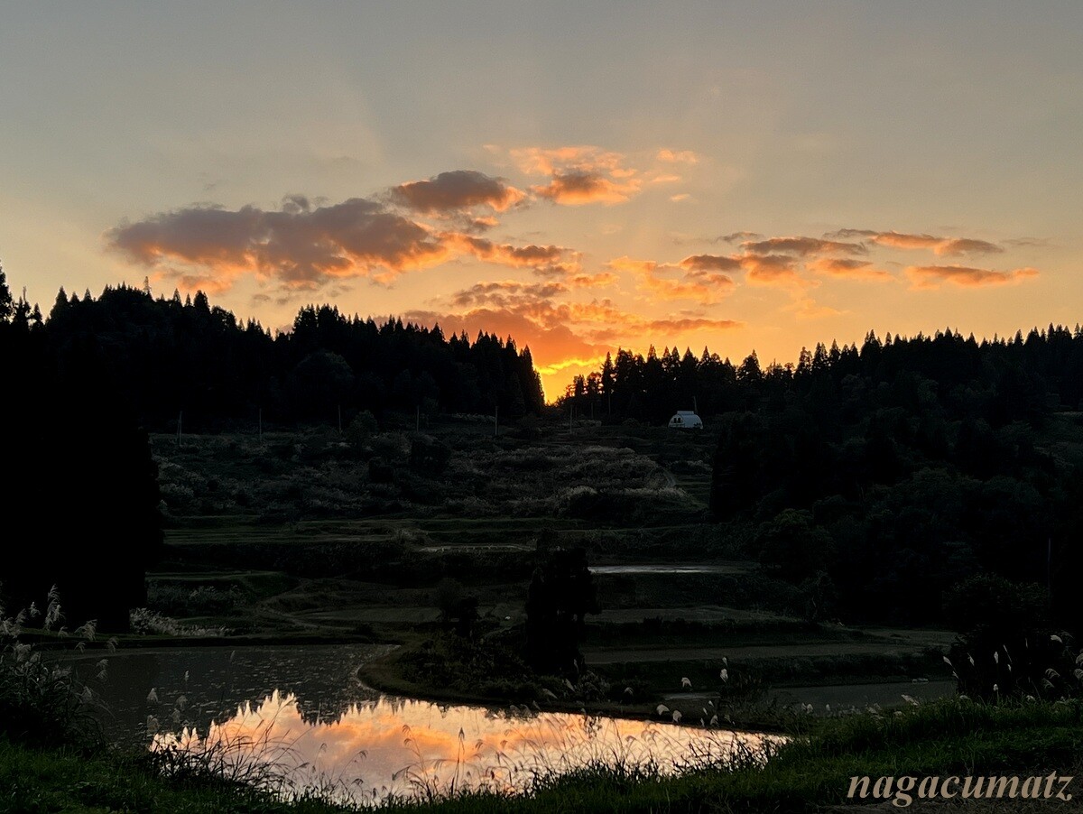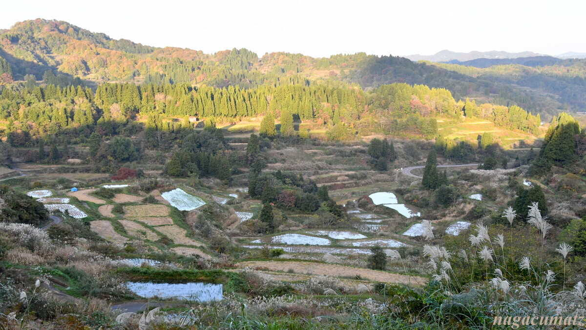 段々畑の畦にススキが生えていて、太陽を浴びて綺麗だった。