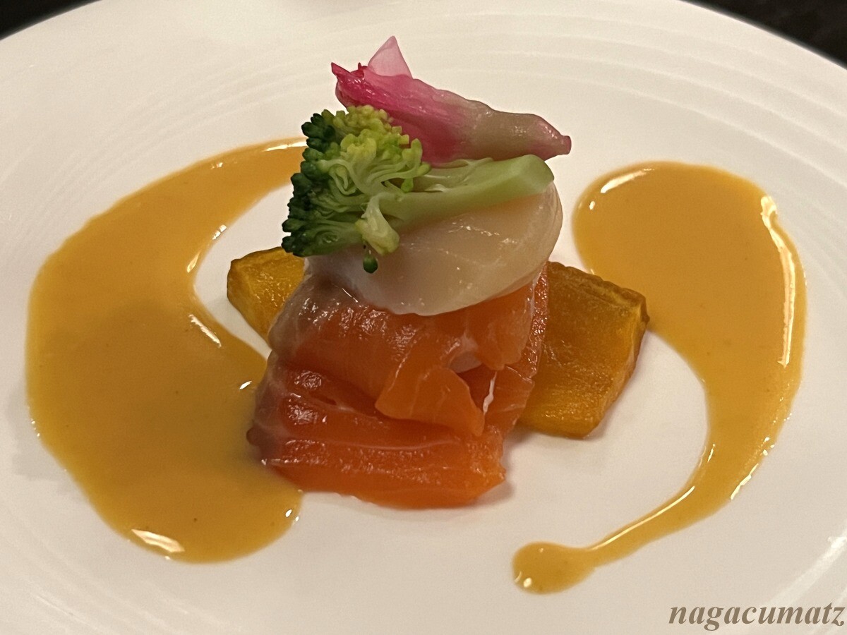 サーモン・貝柱・南瓜のミルフィーユうにソースがけ