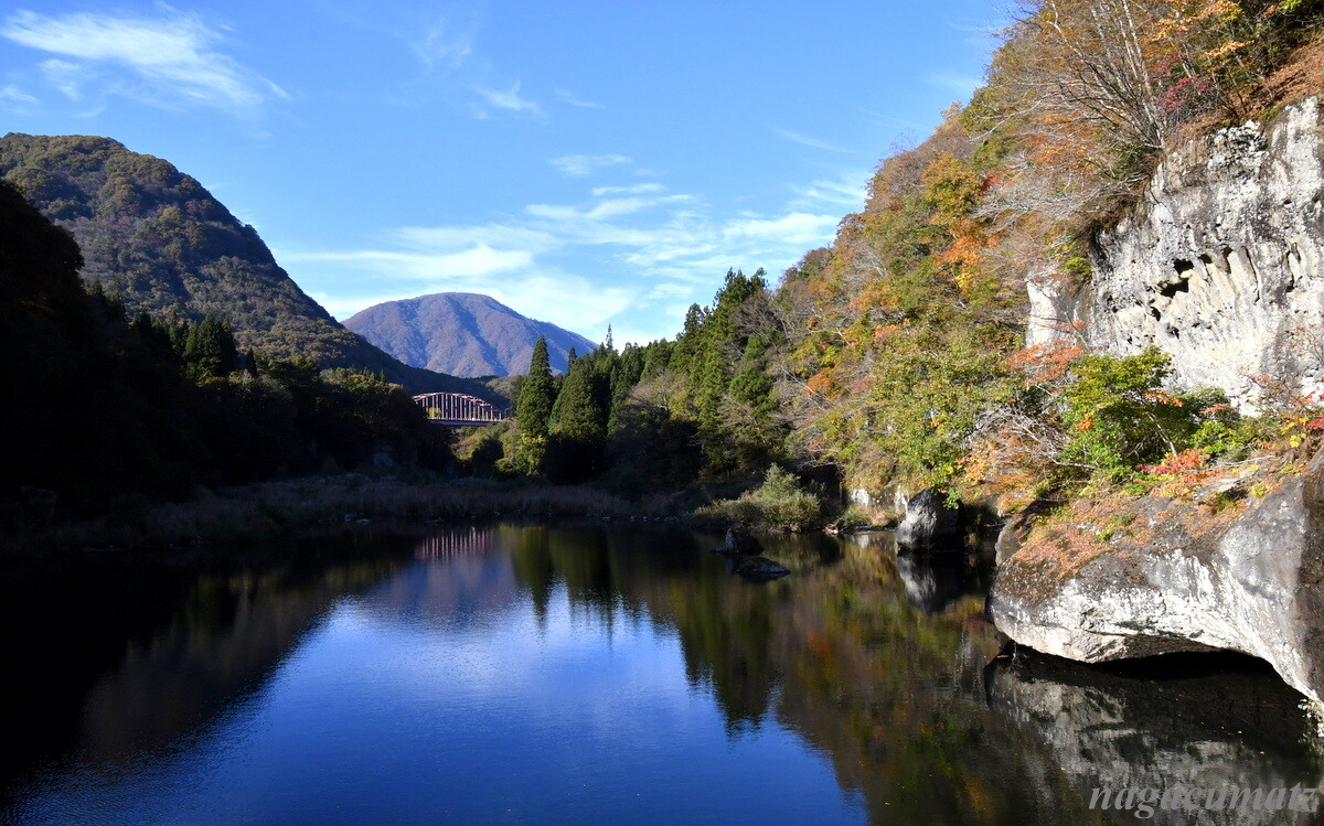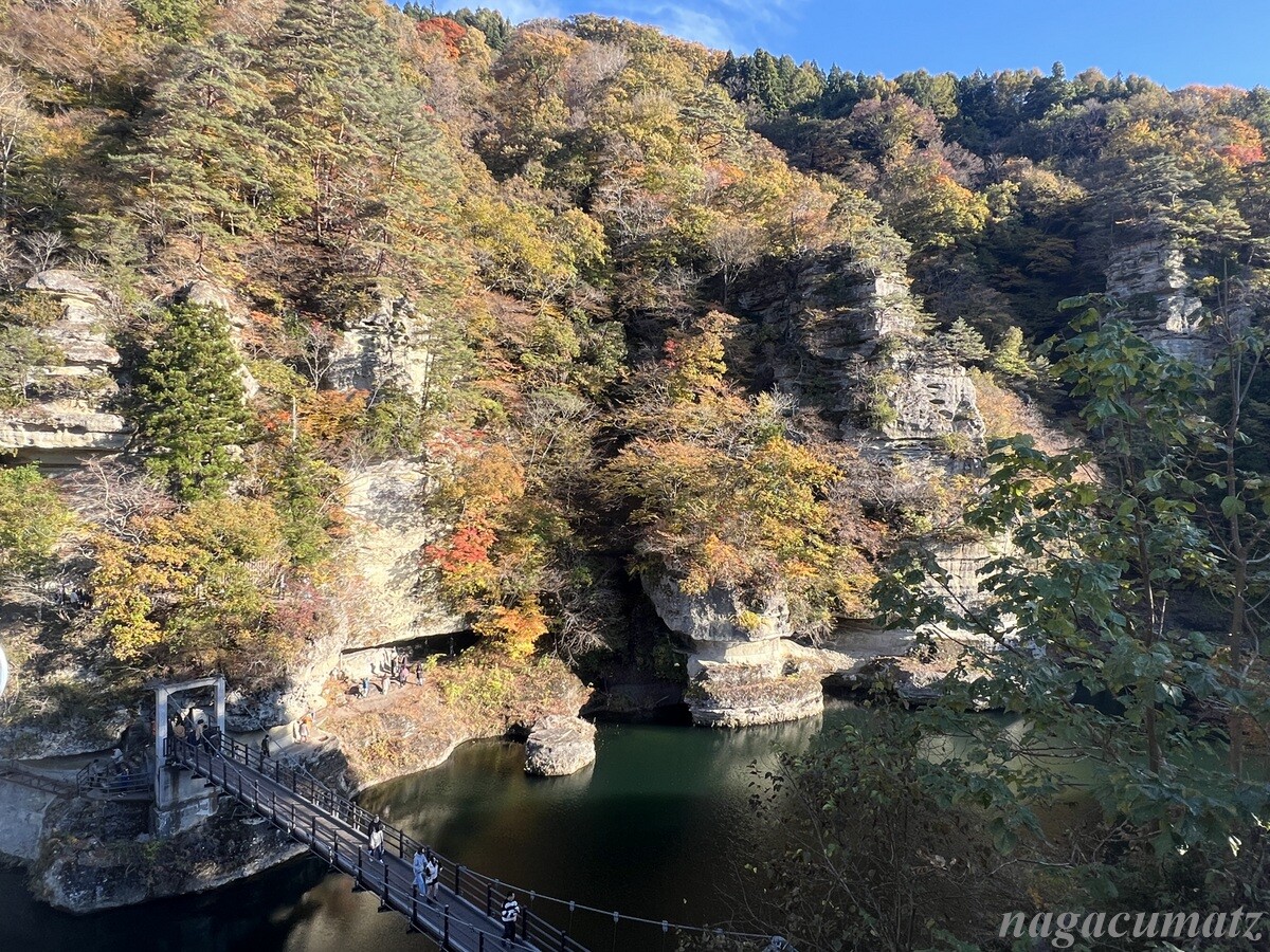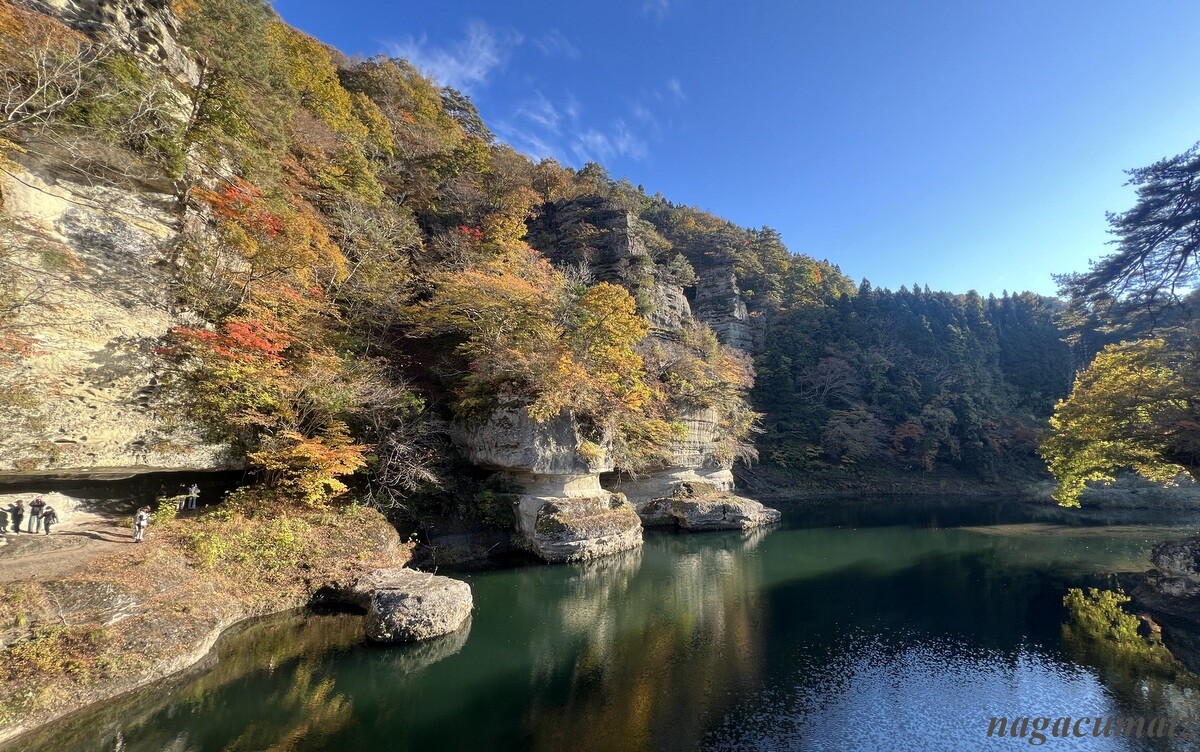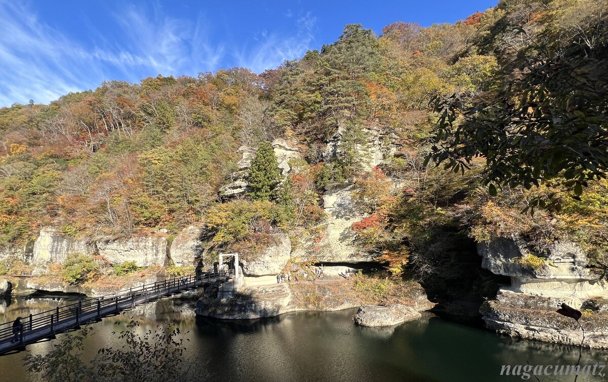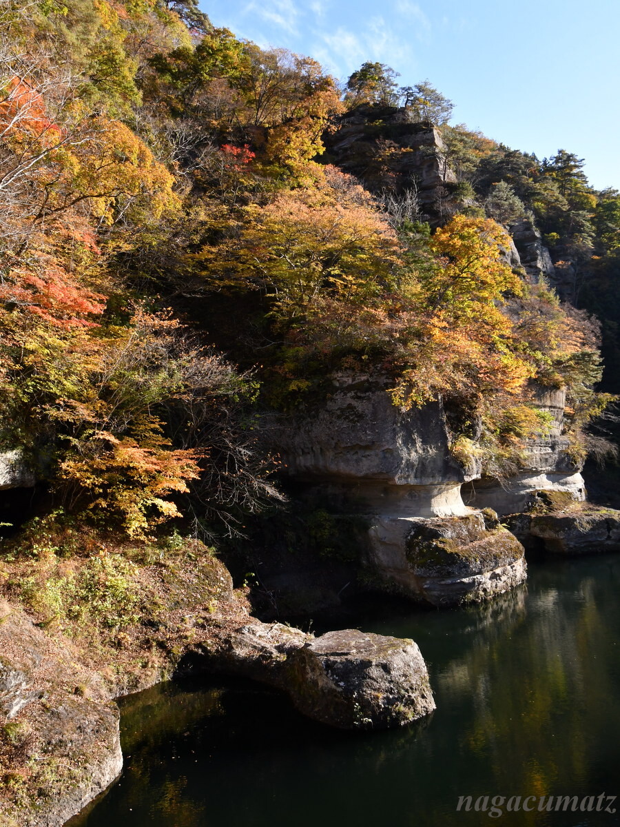 大川(阿賀川)に面した奇岩が塔のようにそそりたつ渓谷。