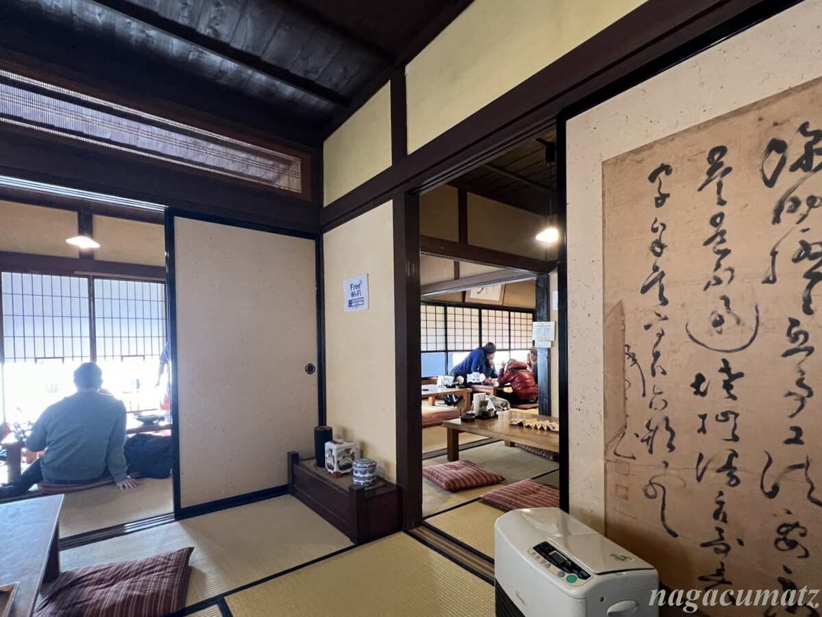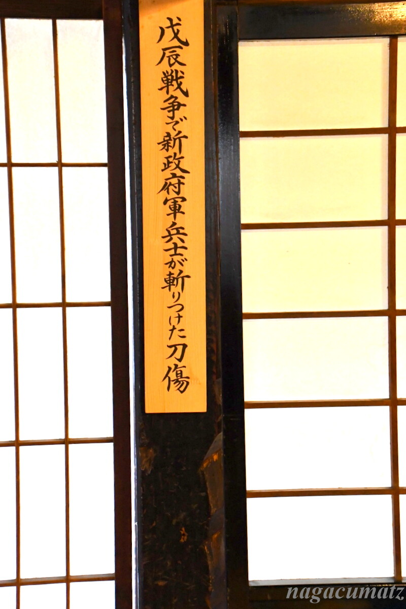 お蕎麦が有名なので、入ったお蕎麦屋さんでは、戊辰戦争で新政府軍が切りつけた時の刀傷が柱に残っていた。