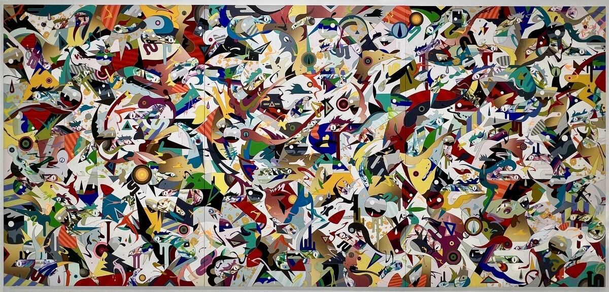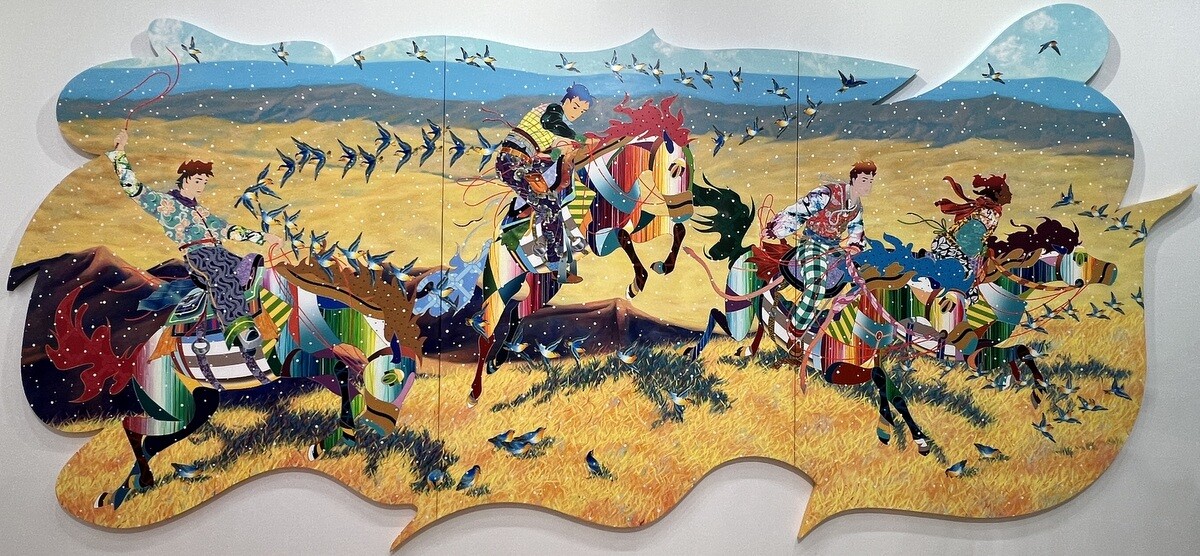 《The Fall High》2023 横幅6メートル、狩野山雪《雪汀水禽図屏風》17世紀に描かれたチドリ、フレデリック・レミントンの米国先住民とピルグリムの戦いが引用されている。