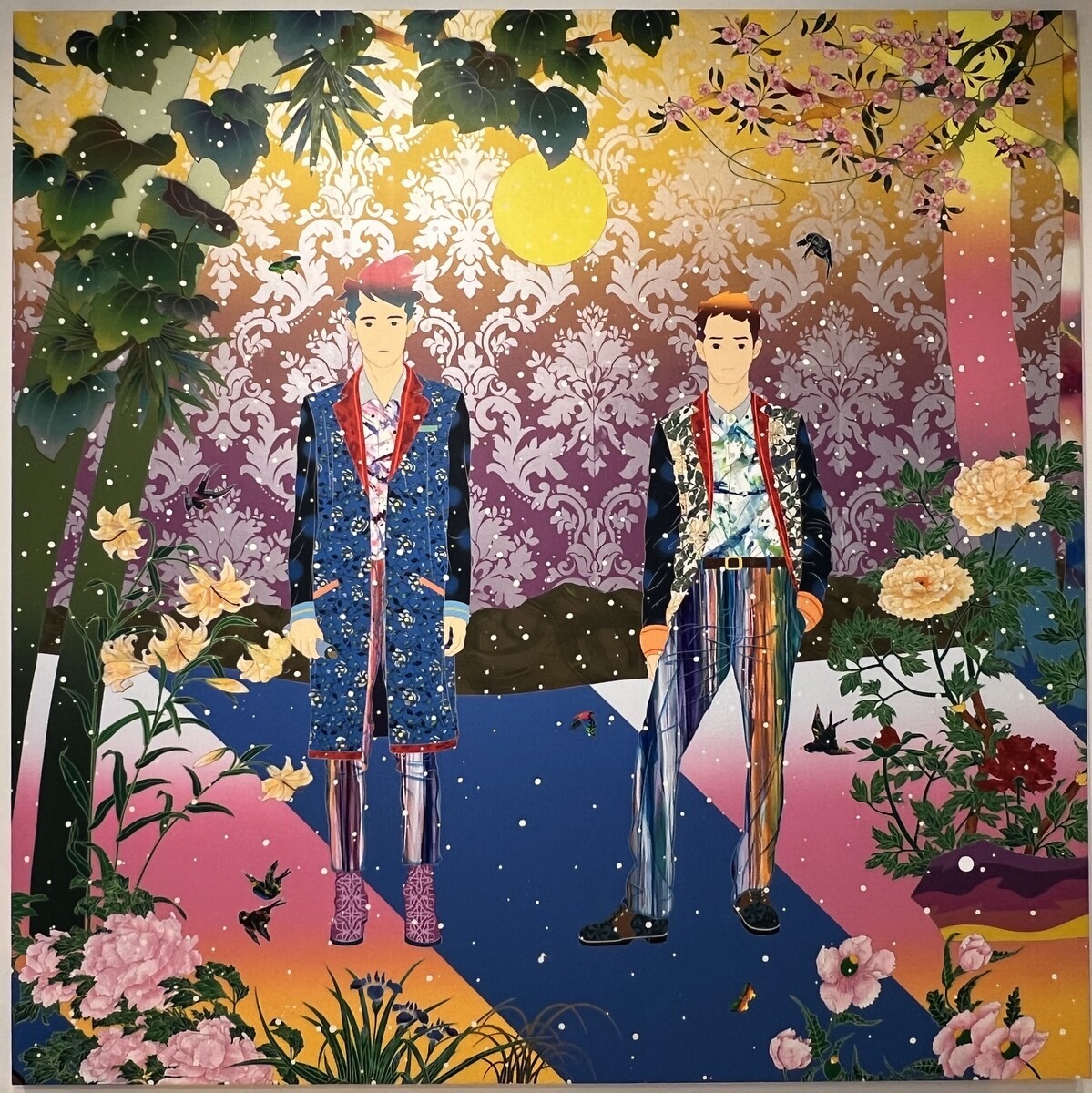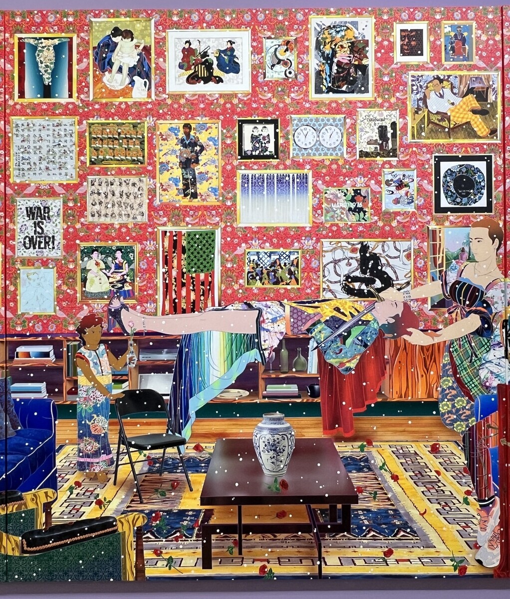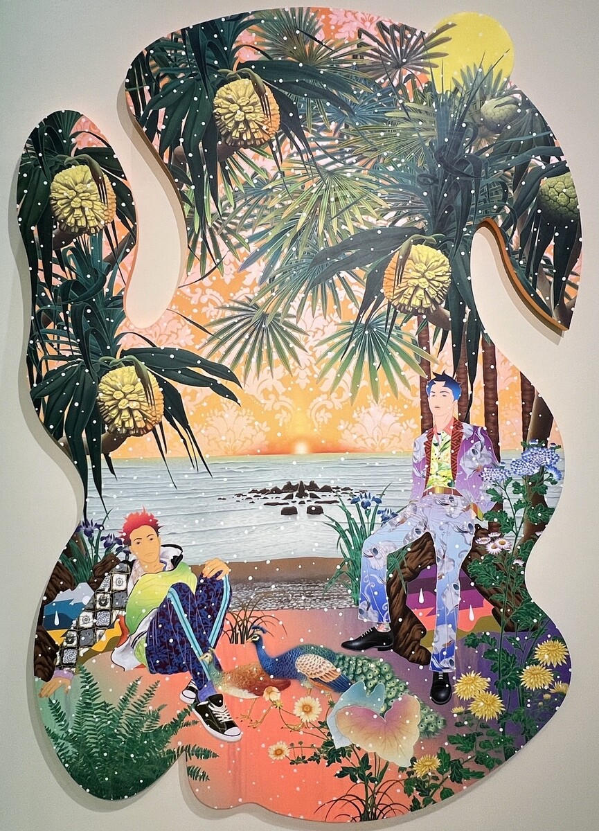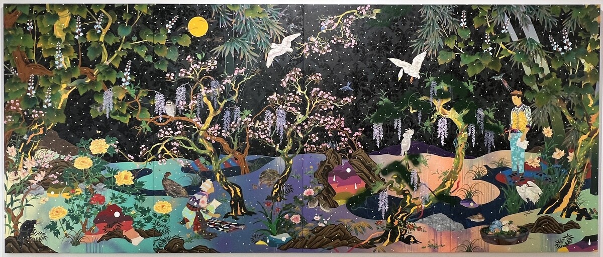 《We Met Thru Match.com》2016 幅6mを超える大作。藤、牡丹、梅、岩に流水など日本の花鳥画のモチーフが満載。よく見ると、伊藤若冲を参照したと思われる白い鸚鵡も。狩野派や土佐派の屏風絵に見られる四季花鳥図などのイメージをスキャニングして再構築し、アンリ・ルソーのジャングルを掛け合わせているそうで、タイトルは、世界最大の出会い系サイトの名前とのこと。