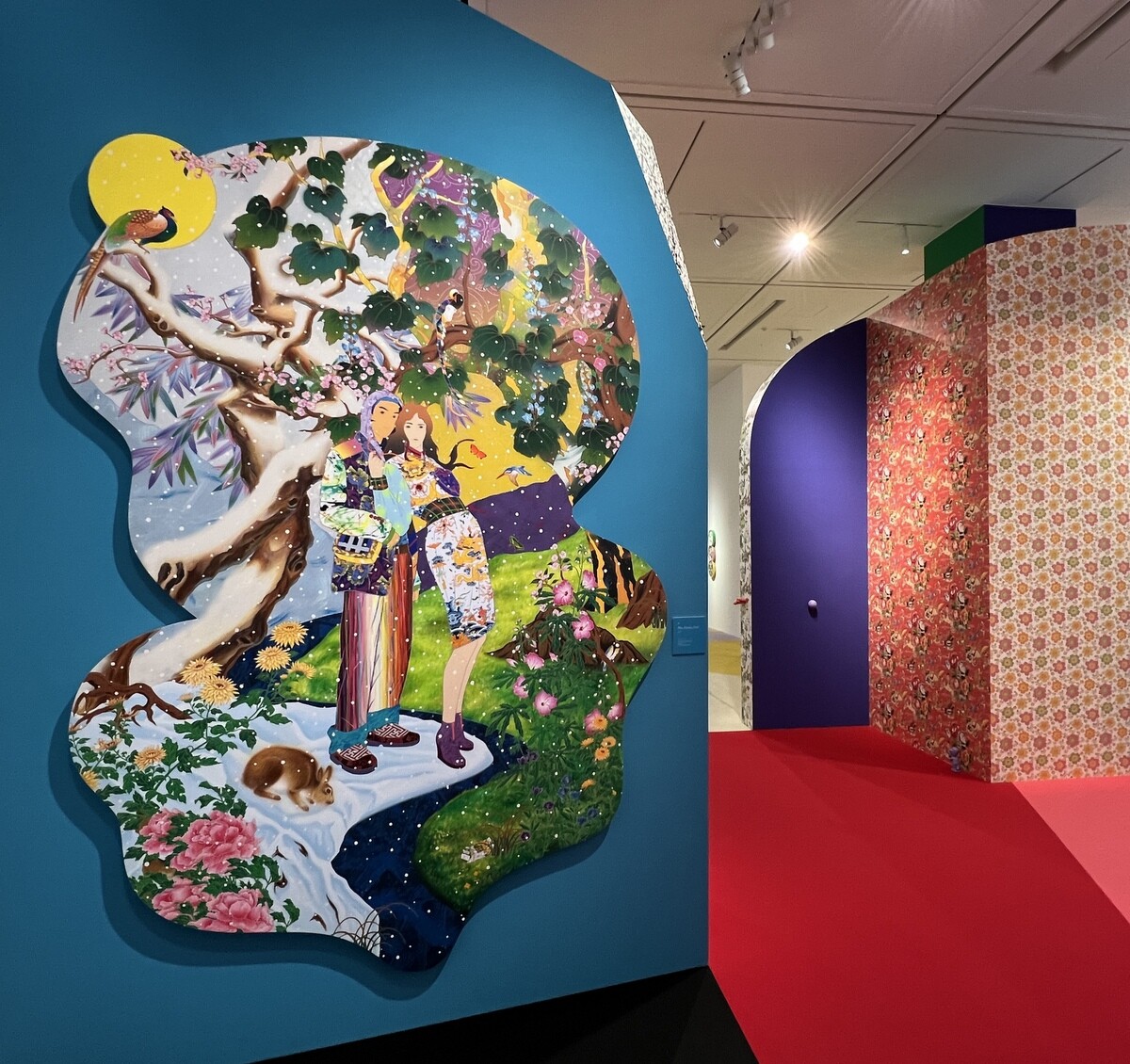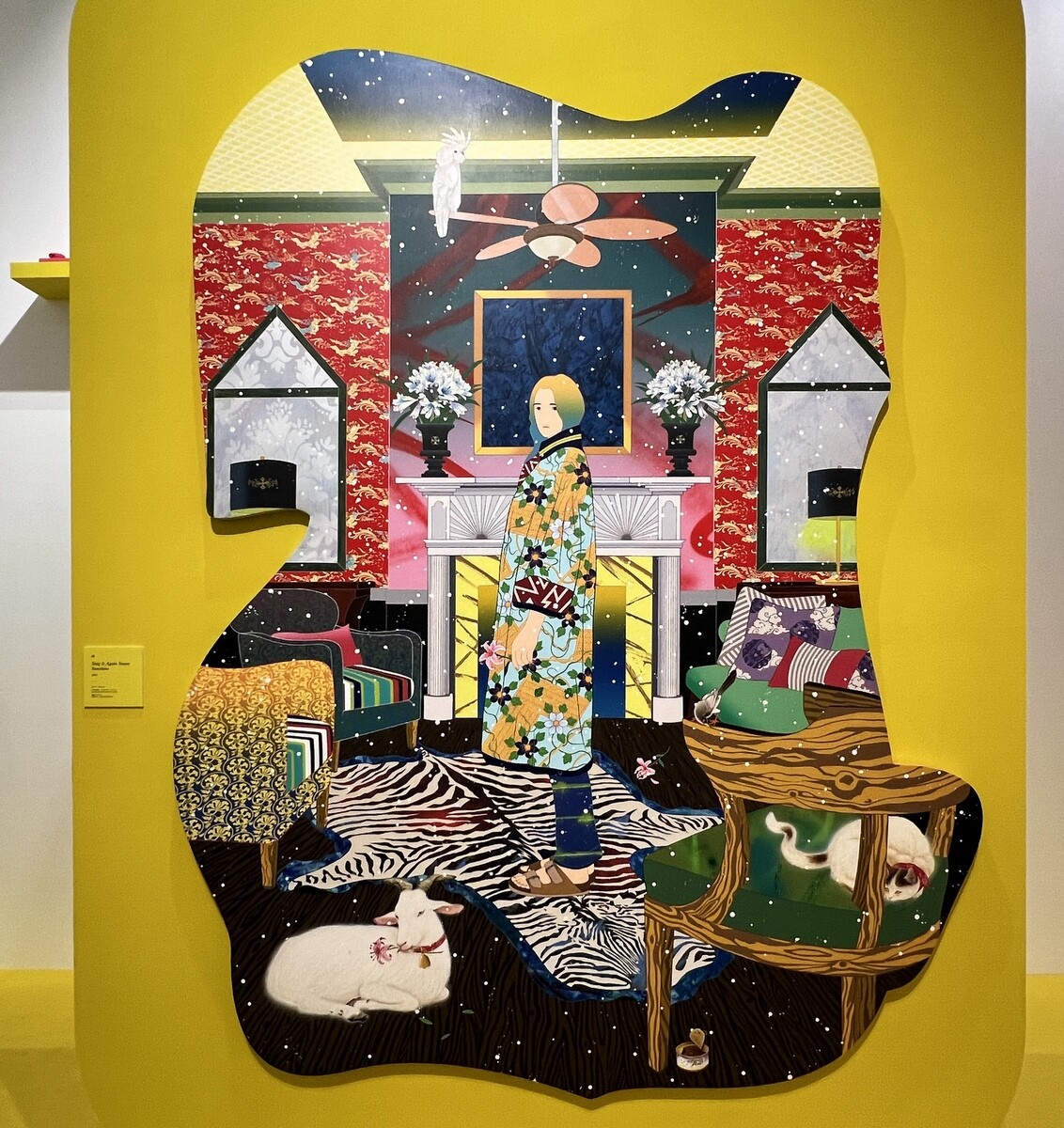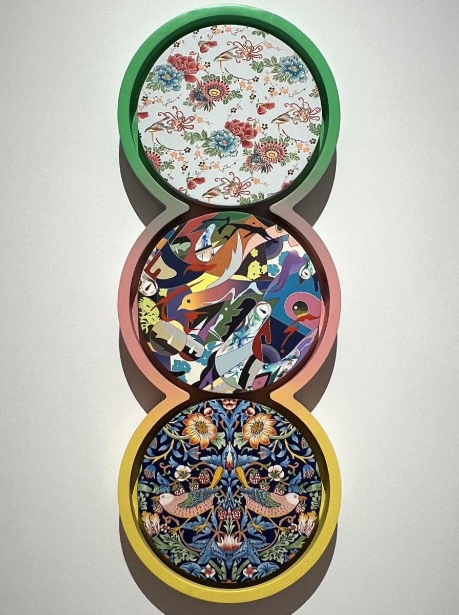 《We Met Thru Match.com》2016 幅6mを超える大作。藤、牡丹、梅、岩に流水など日本の花鳥画のモチーフが満載。よく見ると、伊藤若冲を参照したと思われる白い鸚鵡も。狩野派や土佐派の屏風絵に見られる四季花鳥図などのイメージをスキャニングして再構築し、アンリ・ルソーのジャングルを掛け合わせているそうで、タイトルは、世界最大の出会い系サイトの名前とのこと。