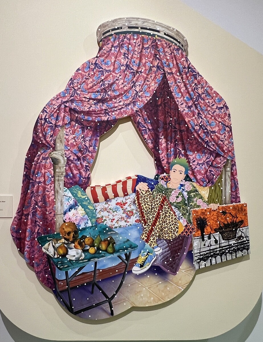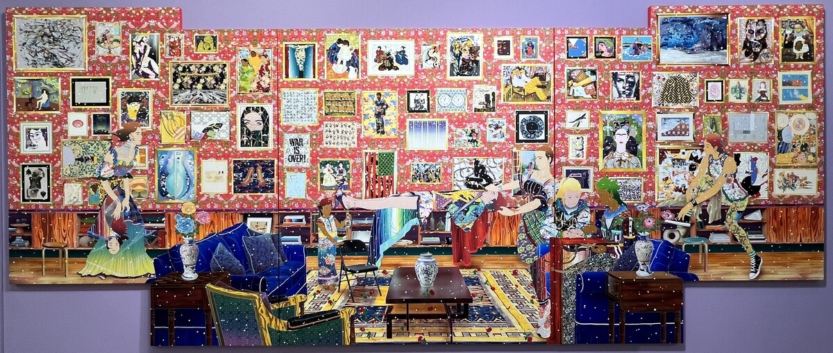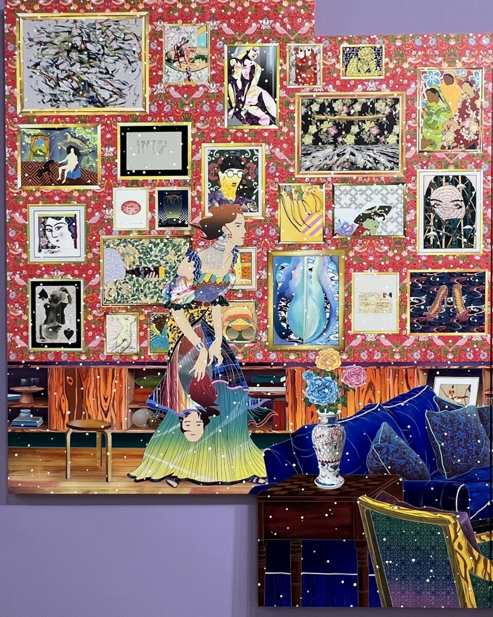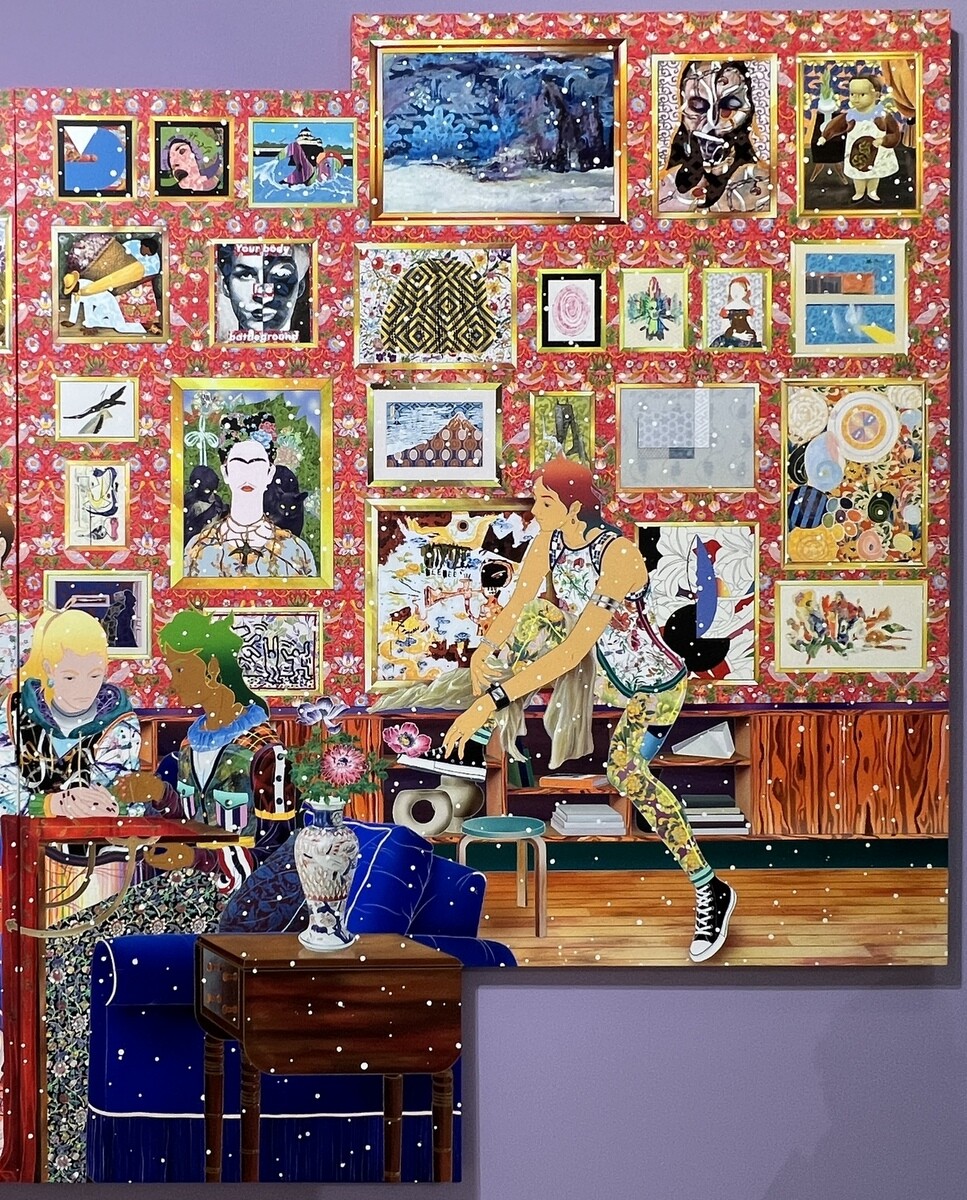 《You, One Me Erase》2023 横幅6メートル。壁の作品は、藤田嗣治、バーバラ・クルーガー、フェリックス・ゴンザレス=トレスらは、自身のアイデンティティと戦った画家達で、画面下はグスタフ・クリムトの《ユディトII》1909、ロセッティの《聖母マリアの少女時代》1849、ティントレットの《スザンナろ長老たち》1555-56 はいずれも女性が聖書の教えを説いている。