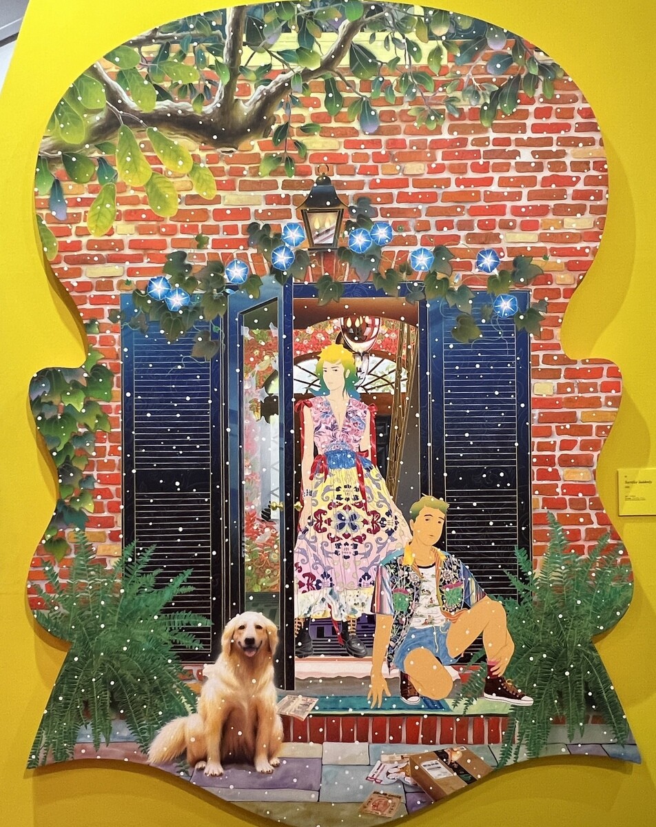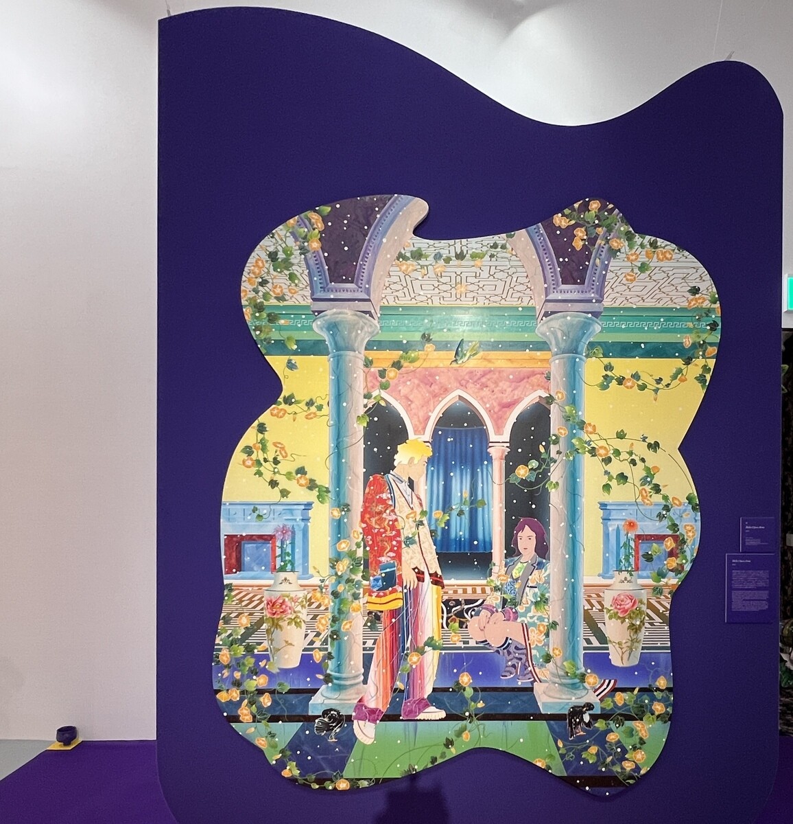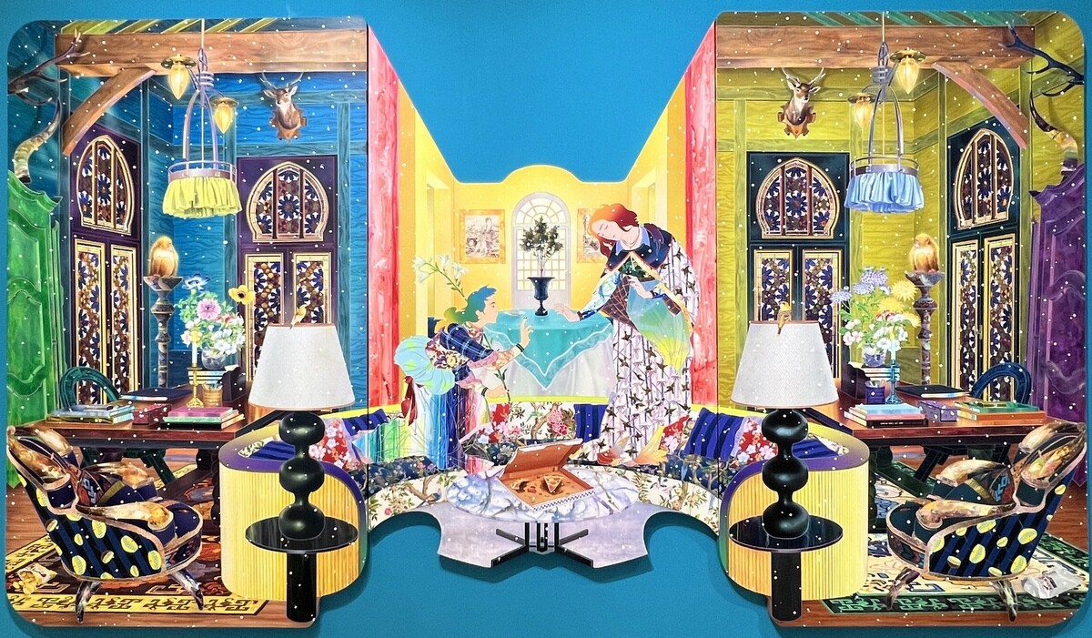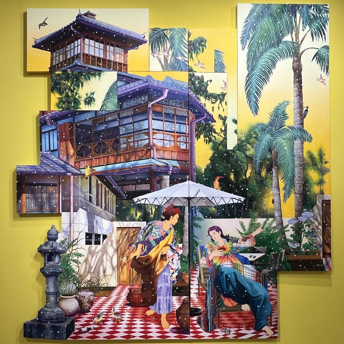 ビバリーヒルズに実在するスペイン植民地時代のリバイバル建築の中庭と、京都の旧三井家下鴨別邸のイメージを掛け合わせた作品。奄美を描いた田中一村やバルビゾン派のコローの風景画のモチーフも。中央の2人は、イタリア・バロック期の画家カラッチの《キリストとサマリアの女》から引用。