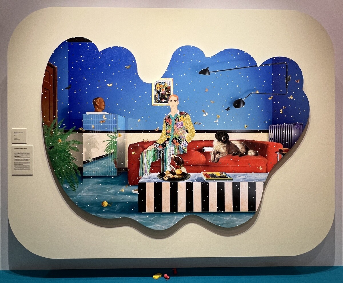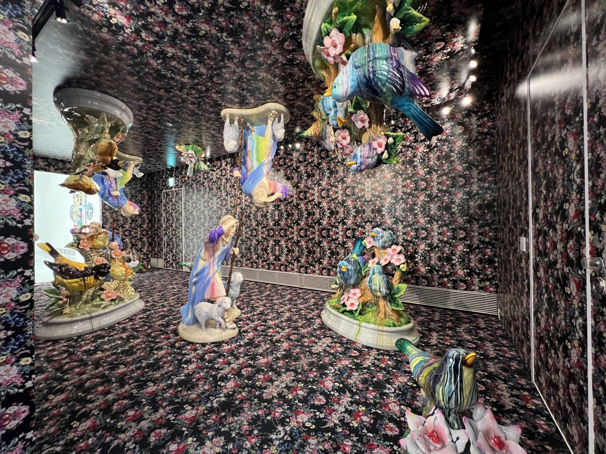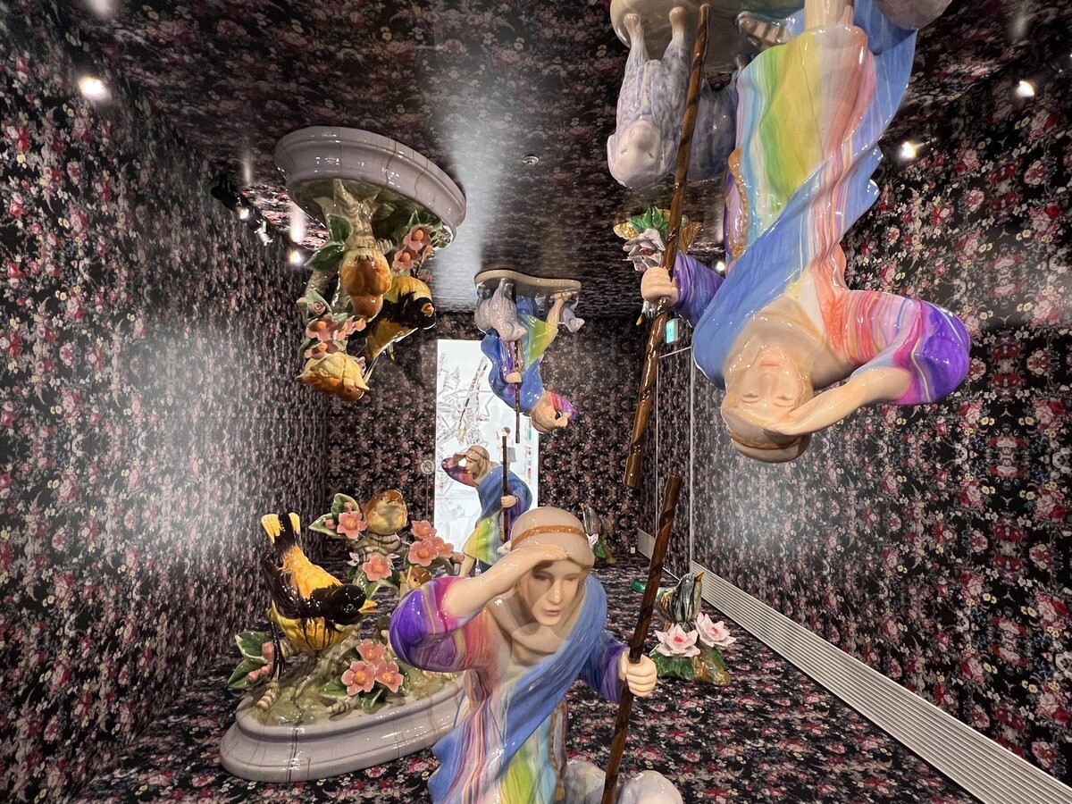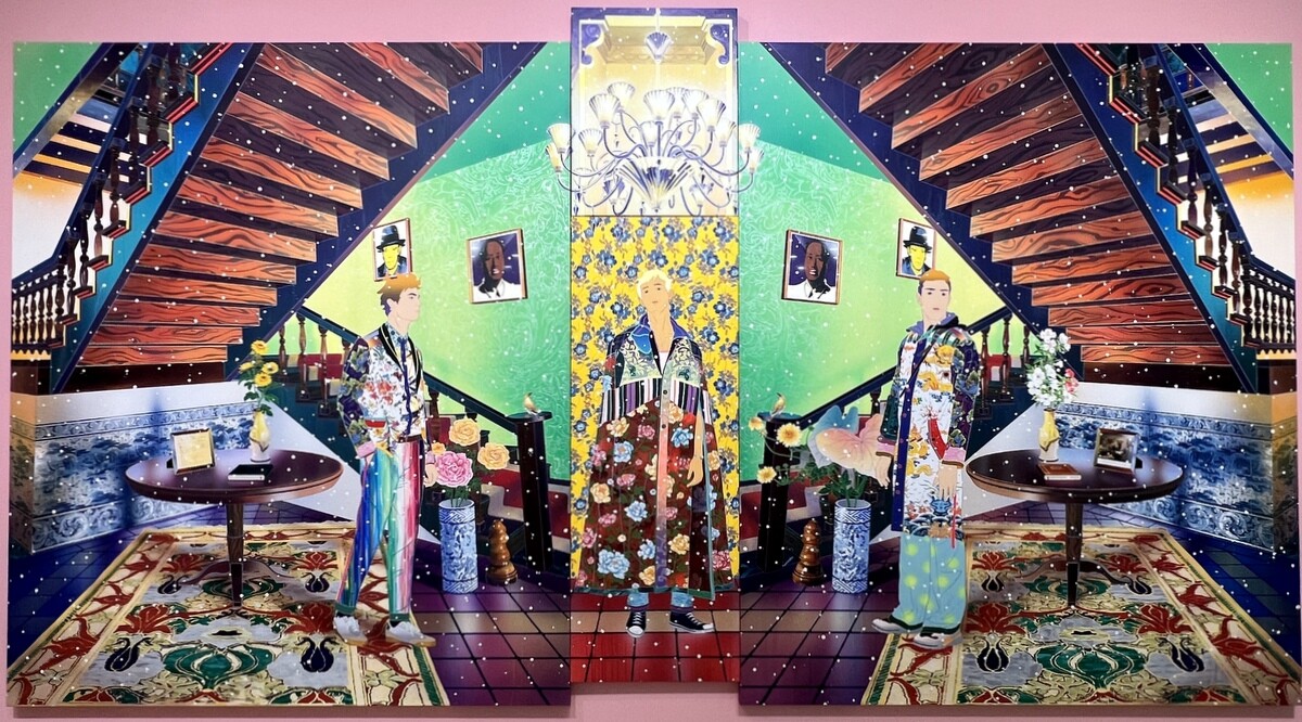 《Black Mao, Yeloow Beuys》2023 左右対称の階段下の空間に2人の人間が対峙する。アンディ・ウォーホールが描いた毛沢東とヨーゼフ・ボイス Joseph Beuys をそれぞれ黒人の毛沢東とアジア人のボイスに描き直した肖像画が飾られている。中央の人物は歌川国貞の役者絵に着想を得たジャケット。