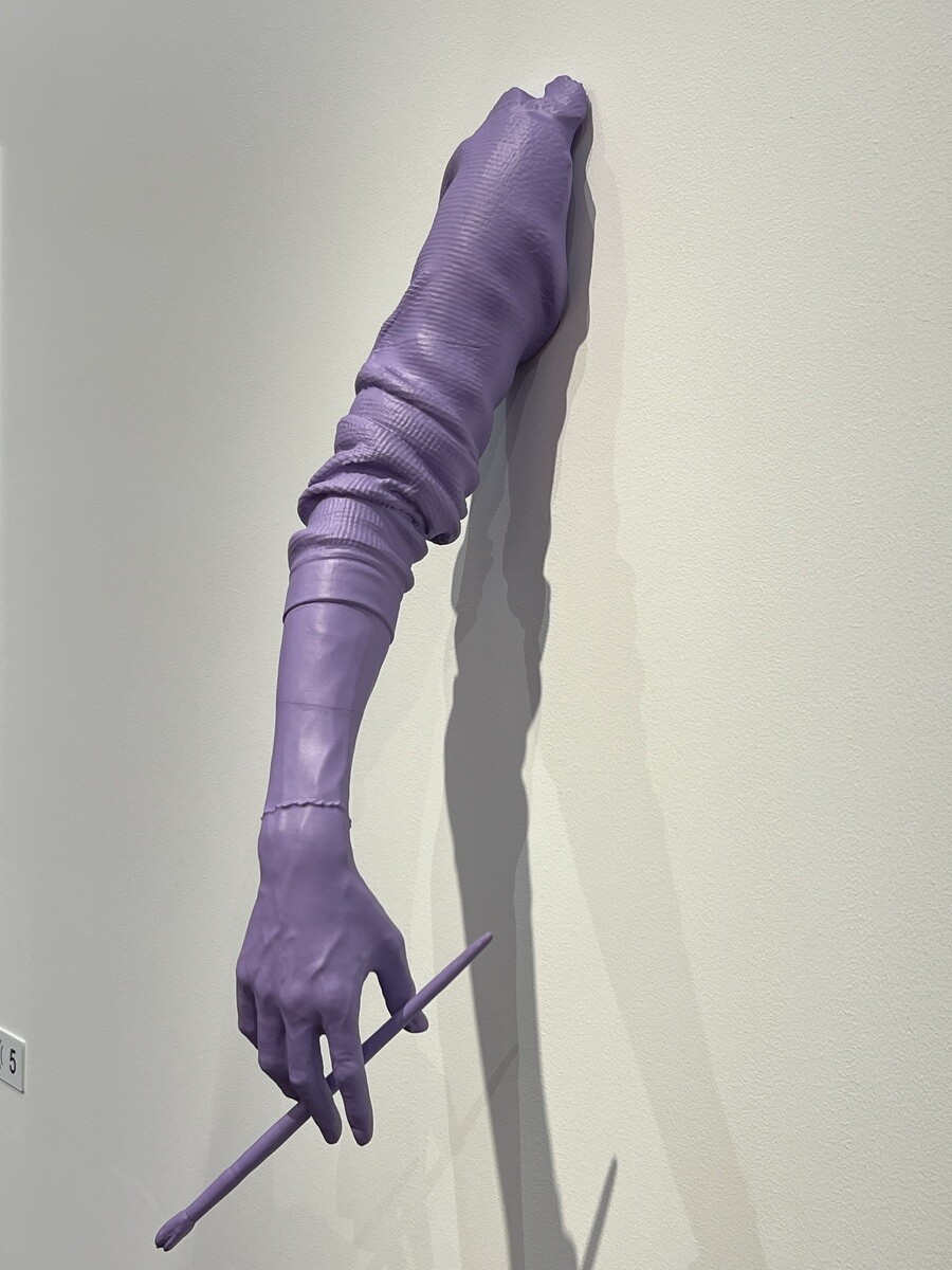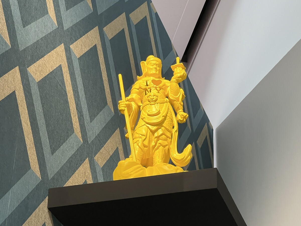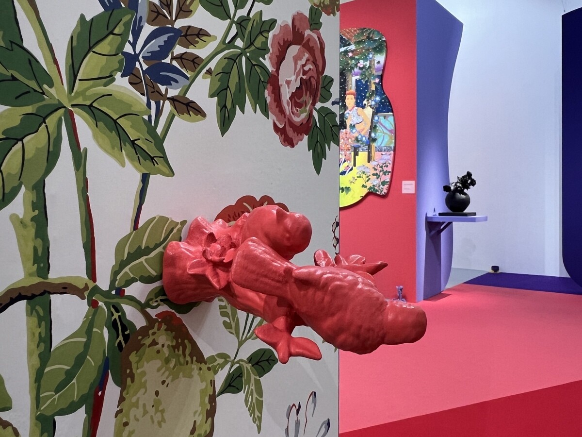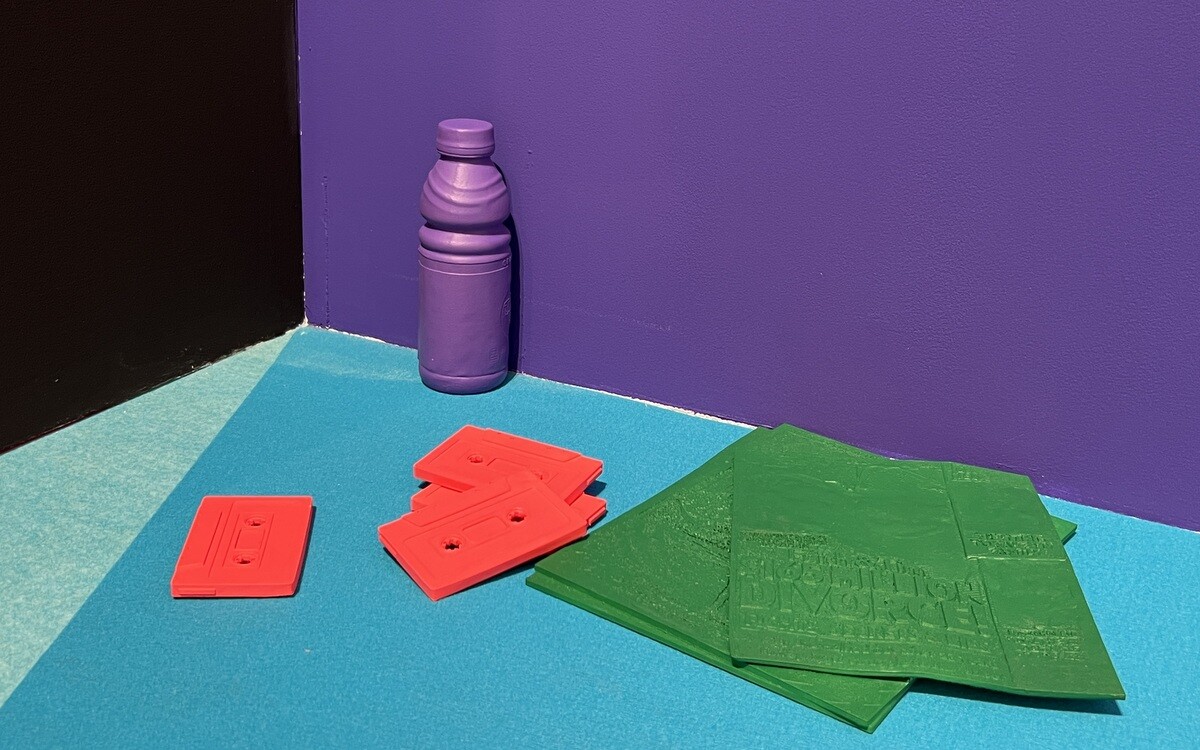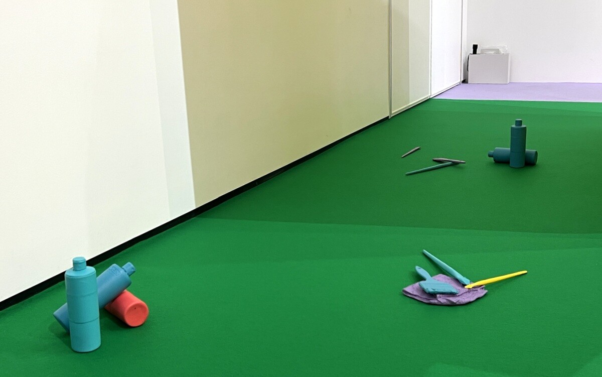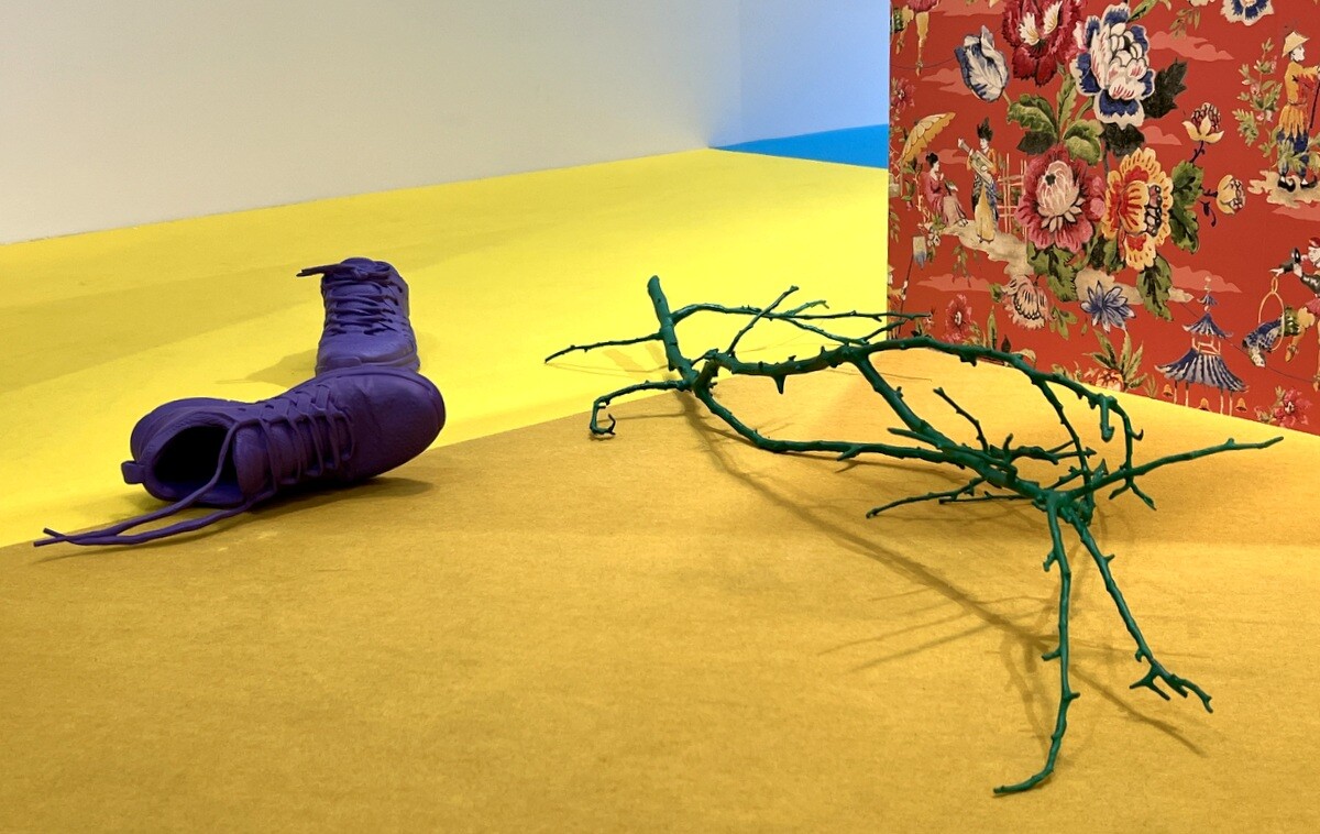 会場のレイアウトや、小物の配置が面白い。小物は、松山氏のNYのアトリエにあるものを3Dプリンターで作ったもの。また、会場のレイアウトの配色も工夫が施されていて面白い。