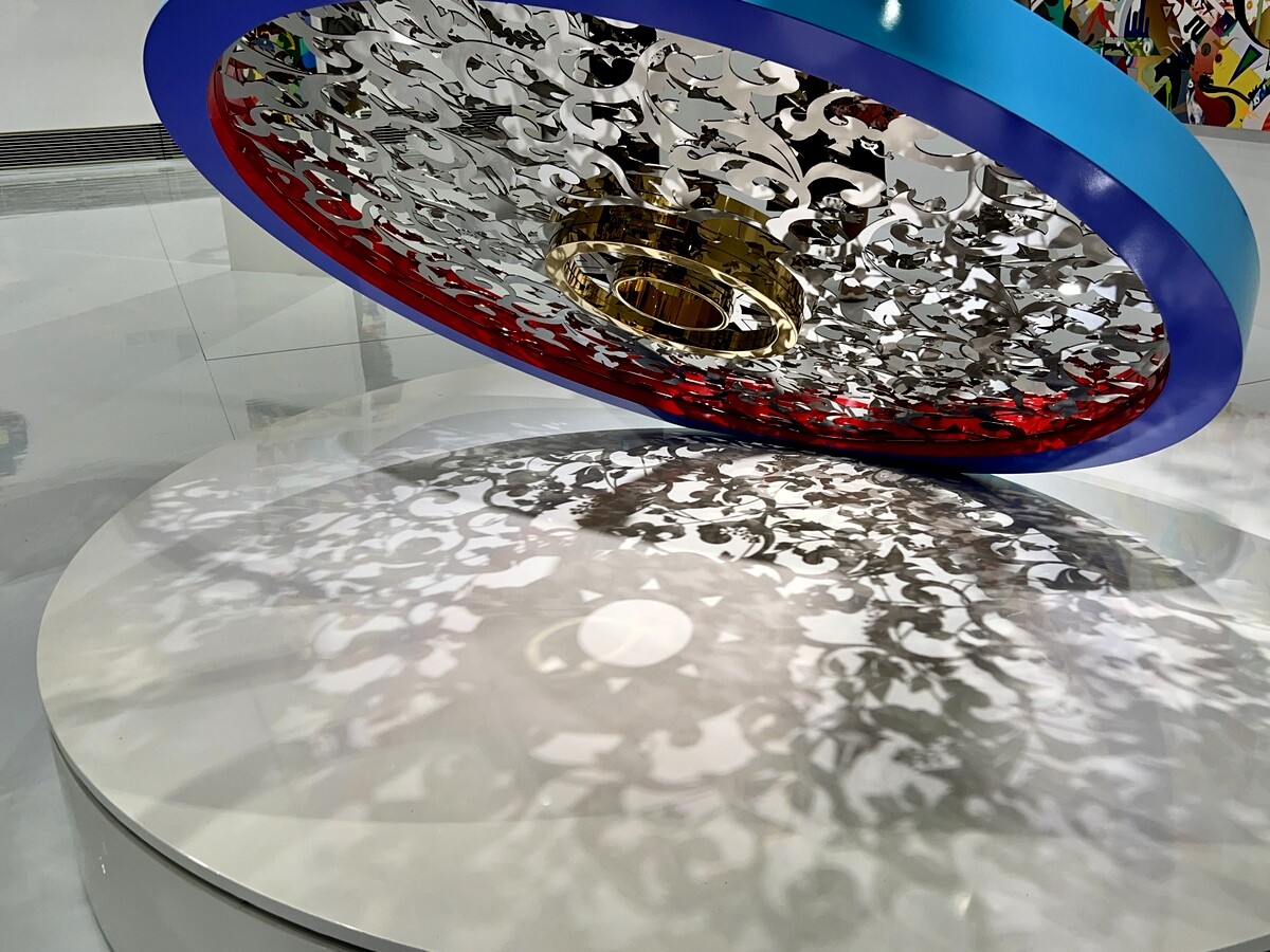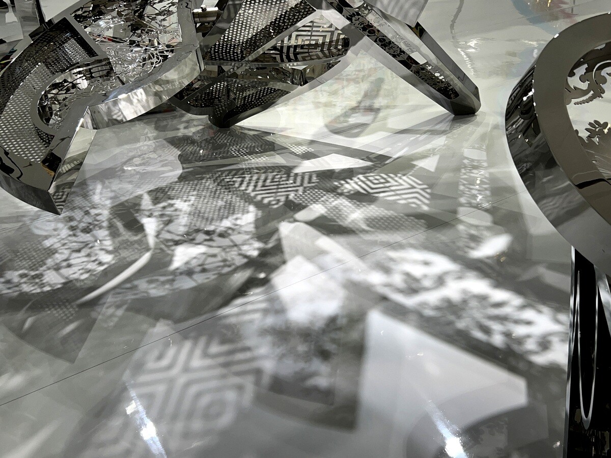鏡面仕上げのステンレスのサークルは日本の銅鏡にヒントを得て唐草模様があしらわれているが、西欧では光り輝くものはラグジュアリーの象徴でもあると。