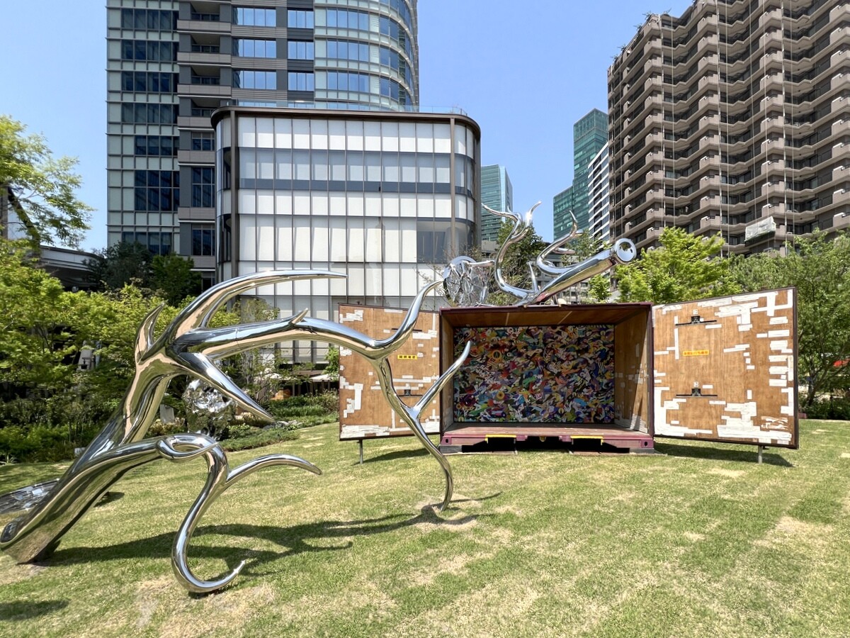 屋外にも作品がある。左《Double Jeopard!》、右《Wheels of Fortune》 日本の神道では神の使いとされる神聖な鹿と、ラグジュアリーを象徴する輝きを重ね合わせたステンレス製の彫刻作品。