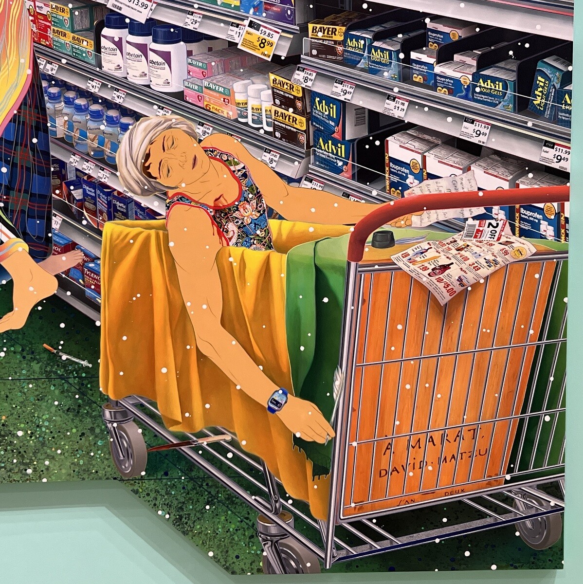 《We The People》2025 フランス古典主義の画家ジャック=ルイ・ダヴィッドの《ソクラテスの死》1787 の構図を再現し、中央の男性はソクラテス。処刑に使われた毒の器の代わりに、着色料を使ったシリアルが描かれ、健康被害が問題視されても提供し続ける食品業界と不健康から富を得る製薬業界をスーパーのシリアル売り場と薬品売り場で示している。右下のカートに乗っている人は、ダヴィッドの《マラーの死》1793が題材で、タイトルの「We The People」はアメリカ合衆国憲法の冒頭文。