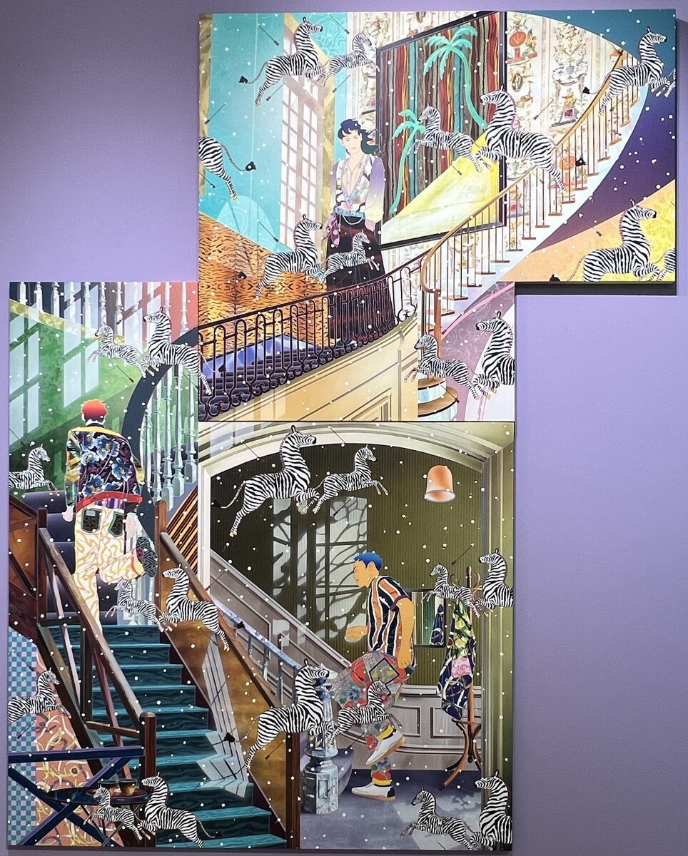 《Lost Full Cycle》2024 シマウマ模様は戦後から文化人に愛されてきた NY名物のイタリア料理店の壁紙で、急速な経済成長やアメリカンドリームを暗示。上は、ドイツの画家ジグマー・ポルケが高度成長への皮肉を込めて描いたヤシの絵がある。