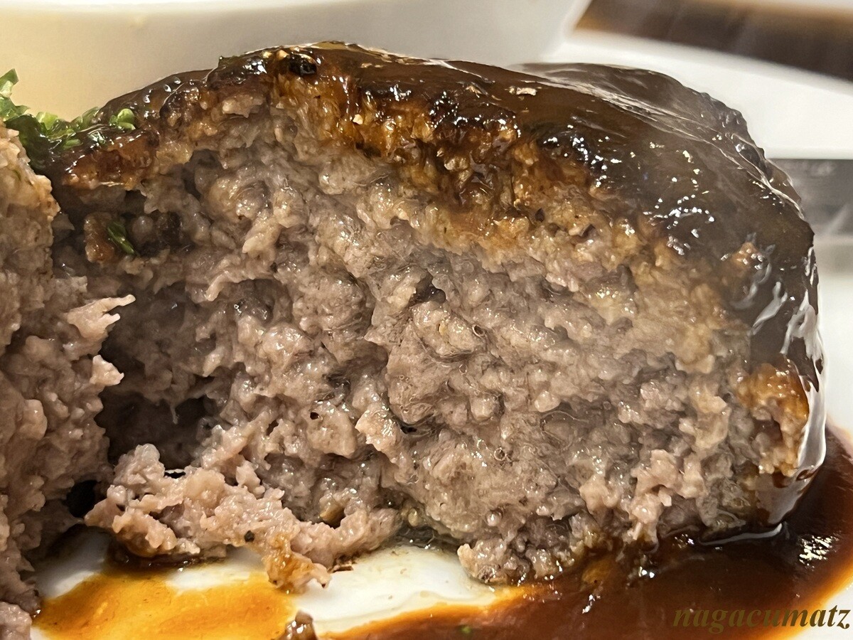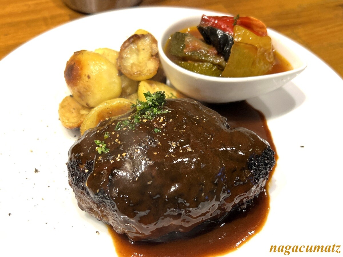 ハンバーグ 2080円 ランチのみのメニューなのだが、予めお願いしておくとディナーでもいただける。ランチよりも1.5倍ほどの大きさとのこと。つなぎが非常に少ないように思うのだが、ふんわりジューシーで美味しい。ラタトゥイユとポテトが付く。