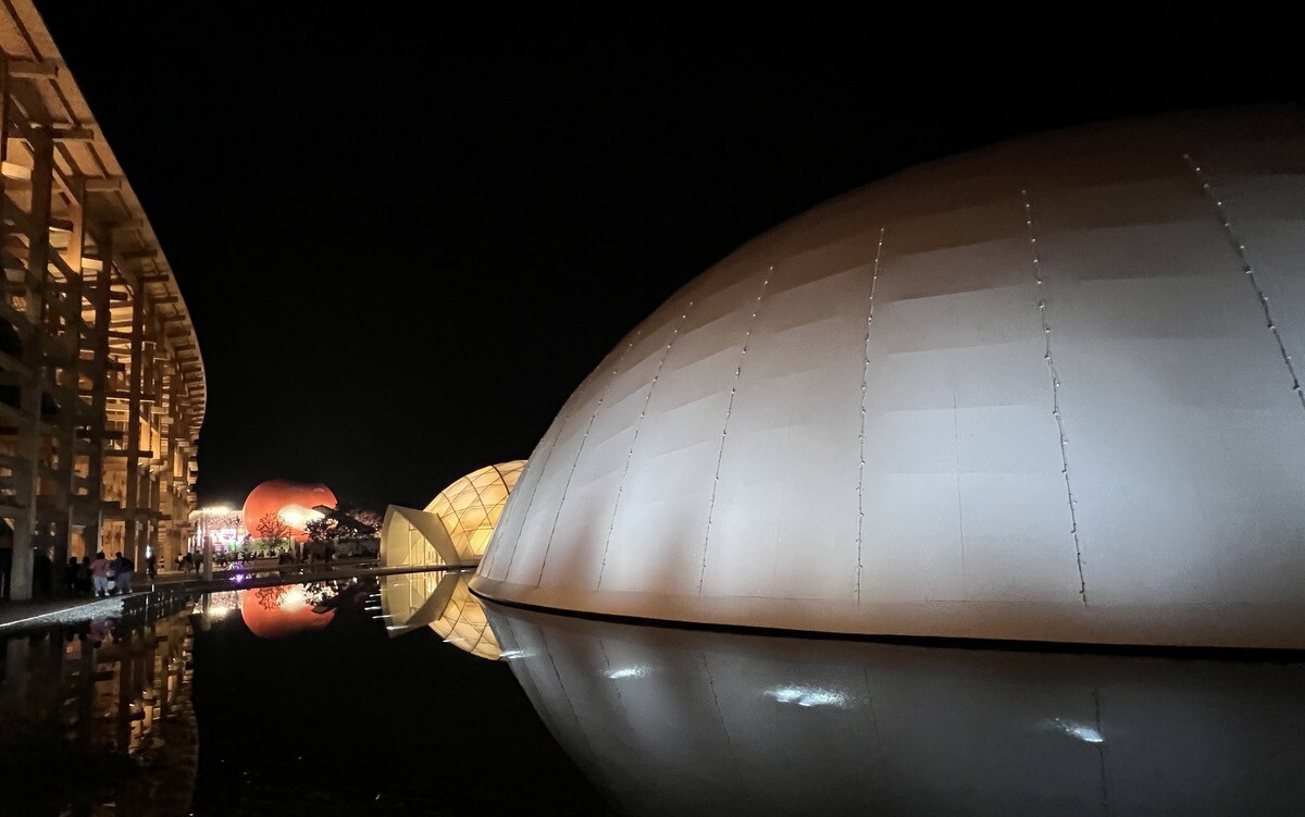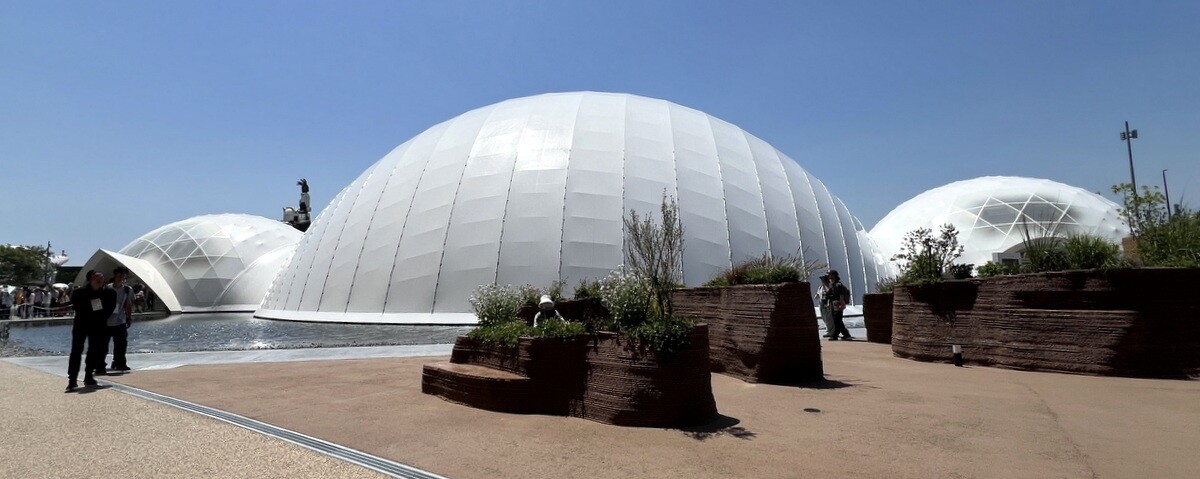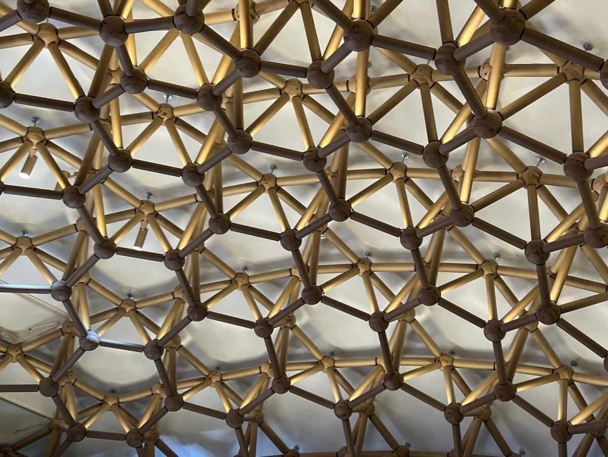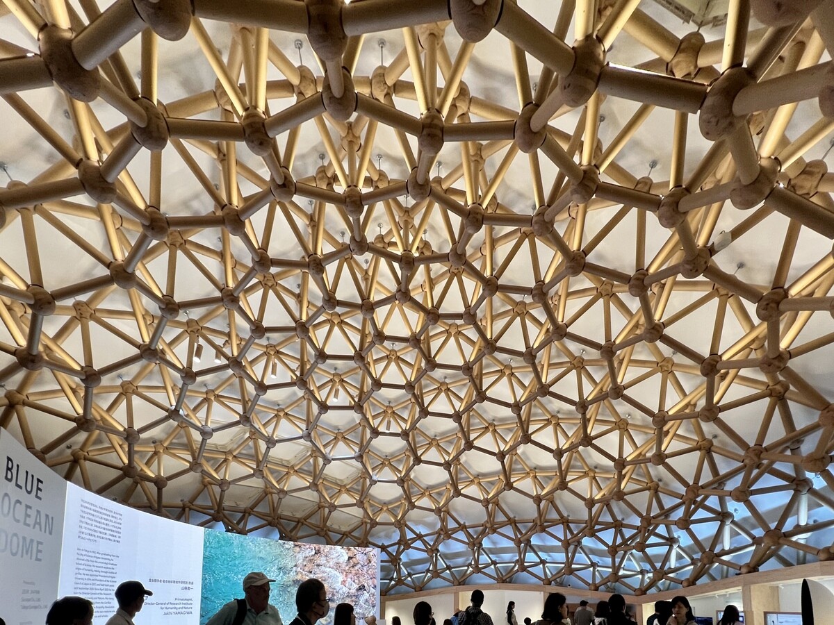 ドームが3つ連なった構造で、真ん中のドームBは直径42メートル、高さ15メートルで、その両脇のドームは直径が19メートル。地盤の杭工事をせず、基礎に再利用可能な鉄板とし、ドームの素材は、坂茂氏の代名詞でもある紙管のほかに、竹とCFRP(炭素繊維強化プラスチック)を使っておられる。ドームAが竹、ドームBがCFRP、ドームCが紙管。