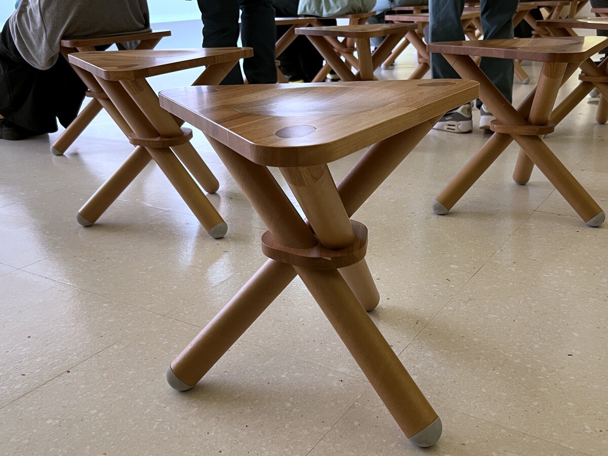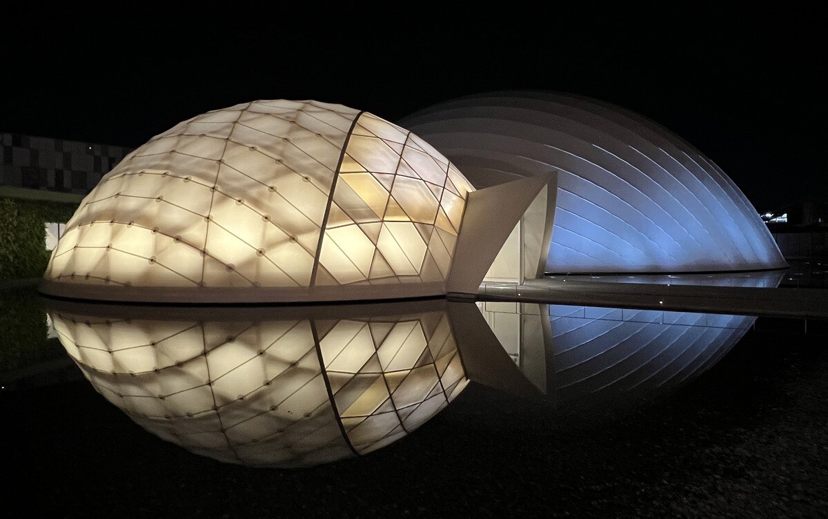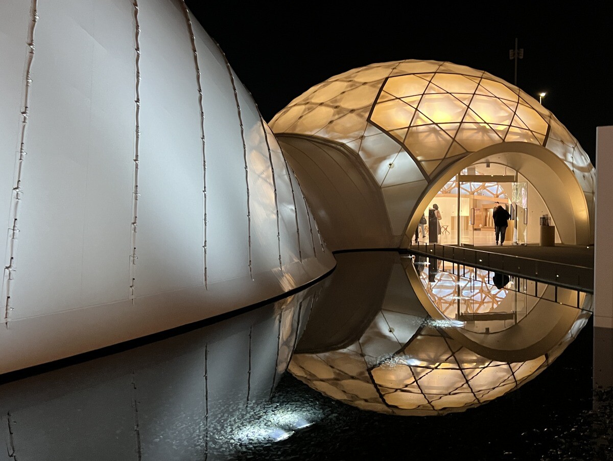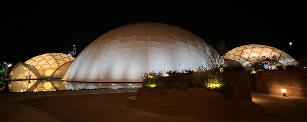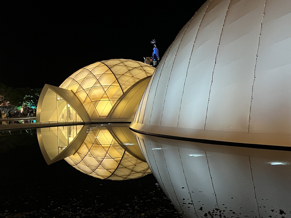ドームが3つ連なった構造で、真ん中のドームBは直径42メートル、高さ15メートルで、その両脇のドームは直径が19メートル。地盤の杭工事をせず、基礎に再利用可能な鉄板とし、ドームの素材は、坂茂氏の代名詞でもある紙管のほかに、竹とCFRP(炭素繊維強化プラスチック)を使っておられる。ドームAが竹、ドームBがCFRP、ドームCが紙管。