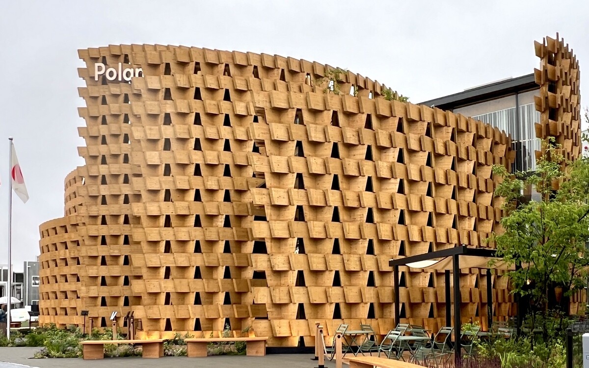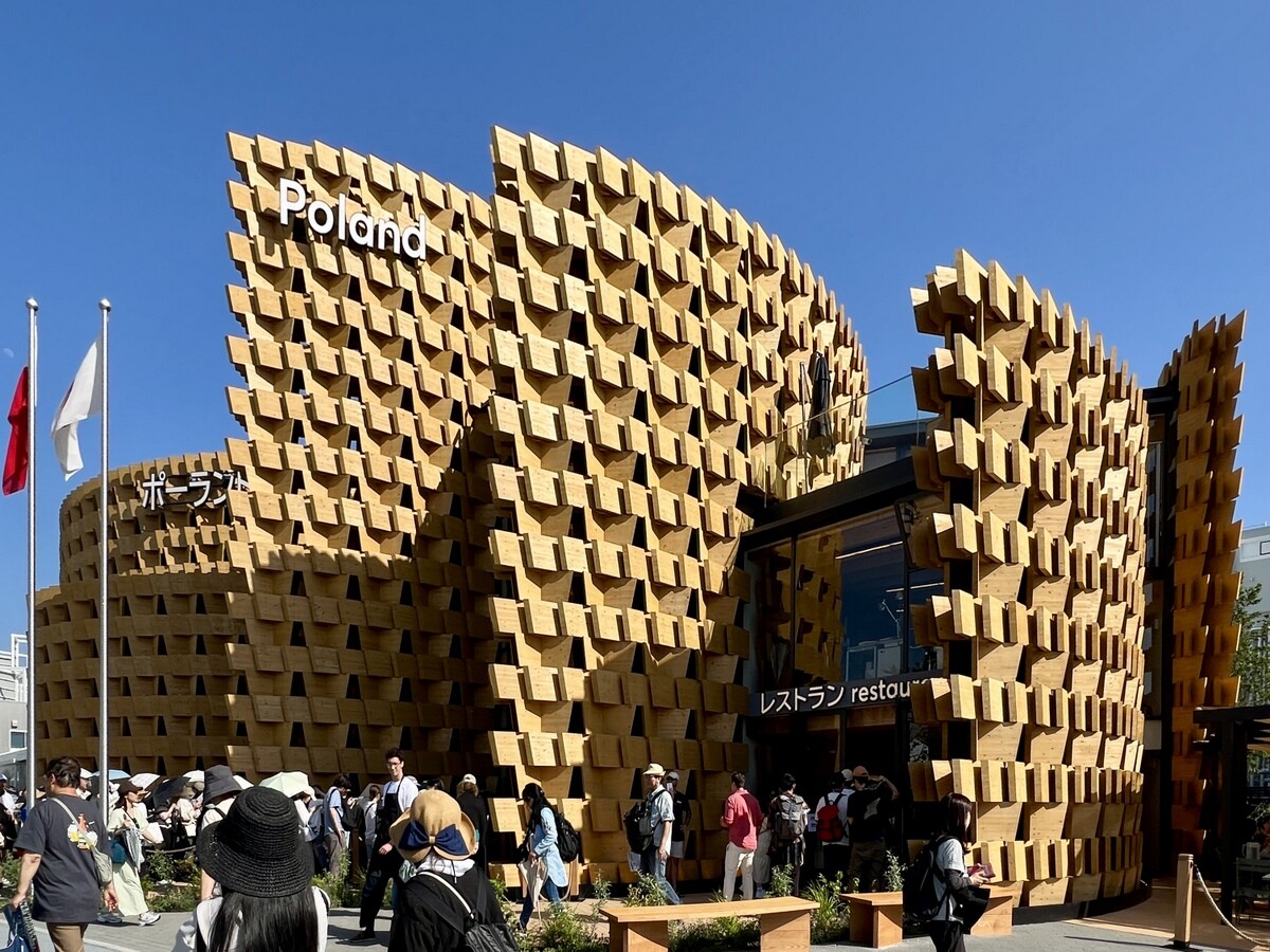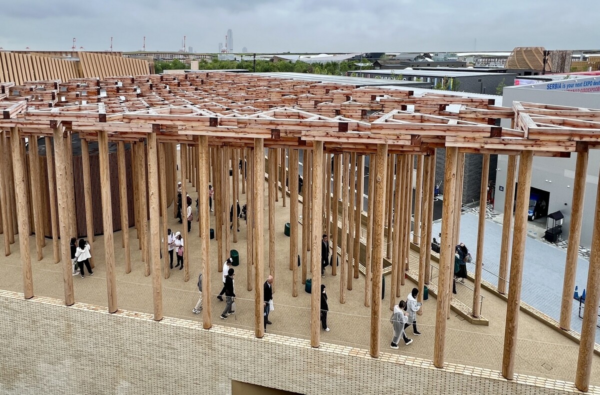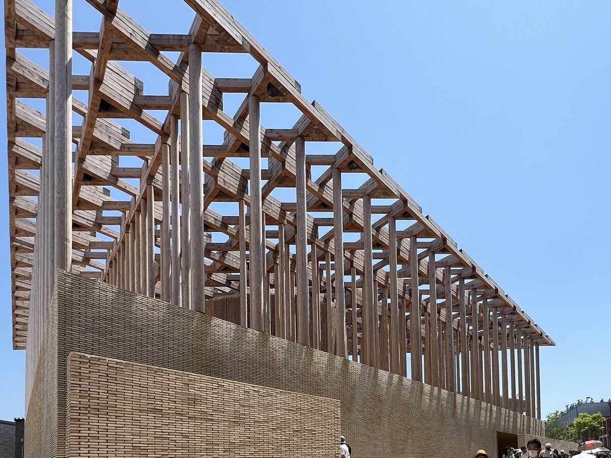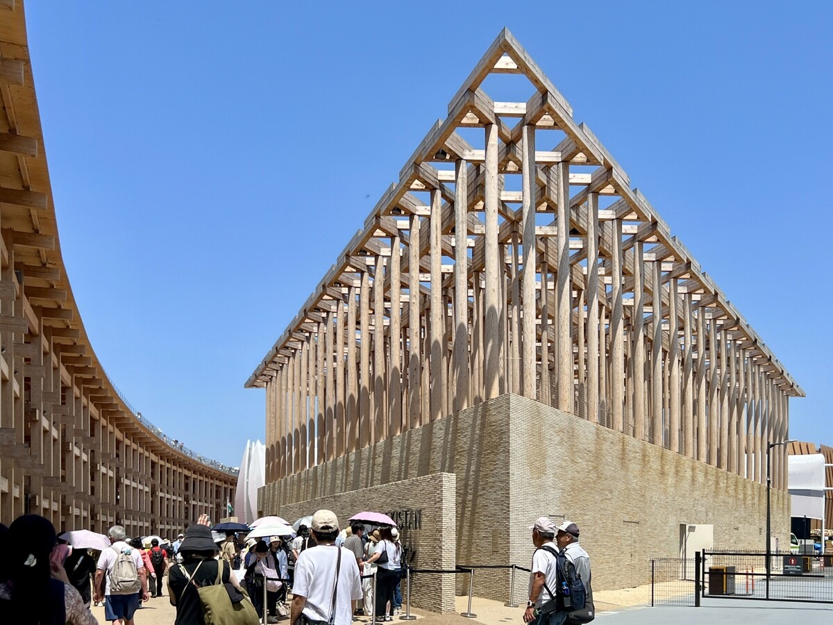アトリエ・ブリュックナー Atelier Bruckner 設計。屋上には、大阪近郊のスギ材を使った高さ8メートルの彫刻群があり、その木材は会期後はウズベキスタンで再利用されるのだそう。