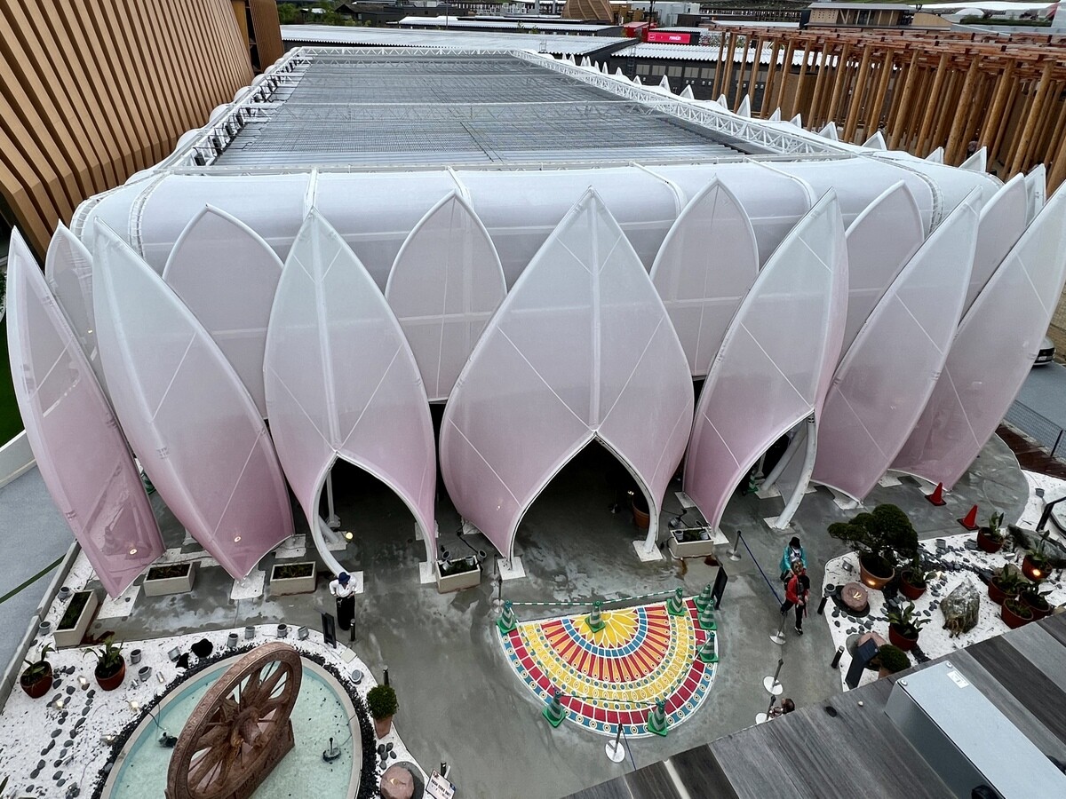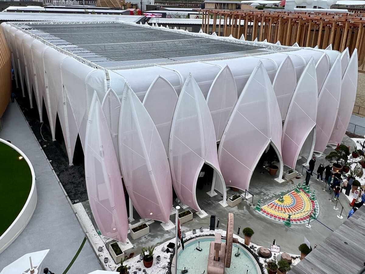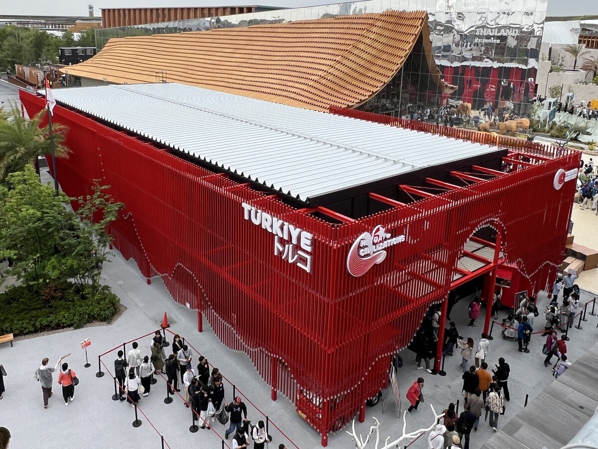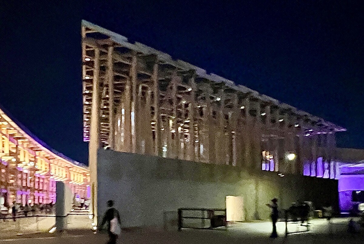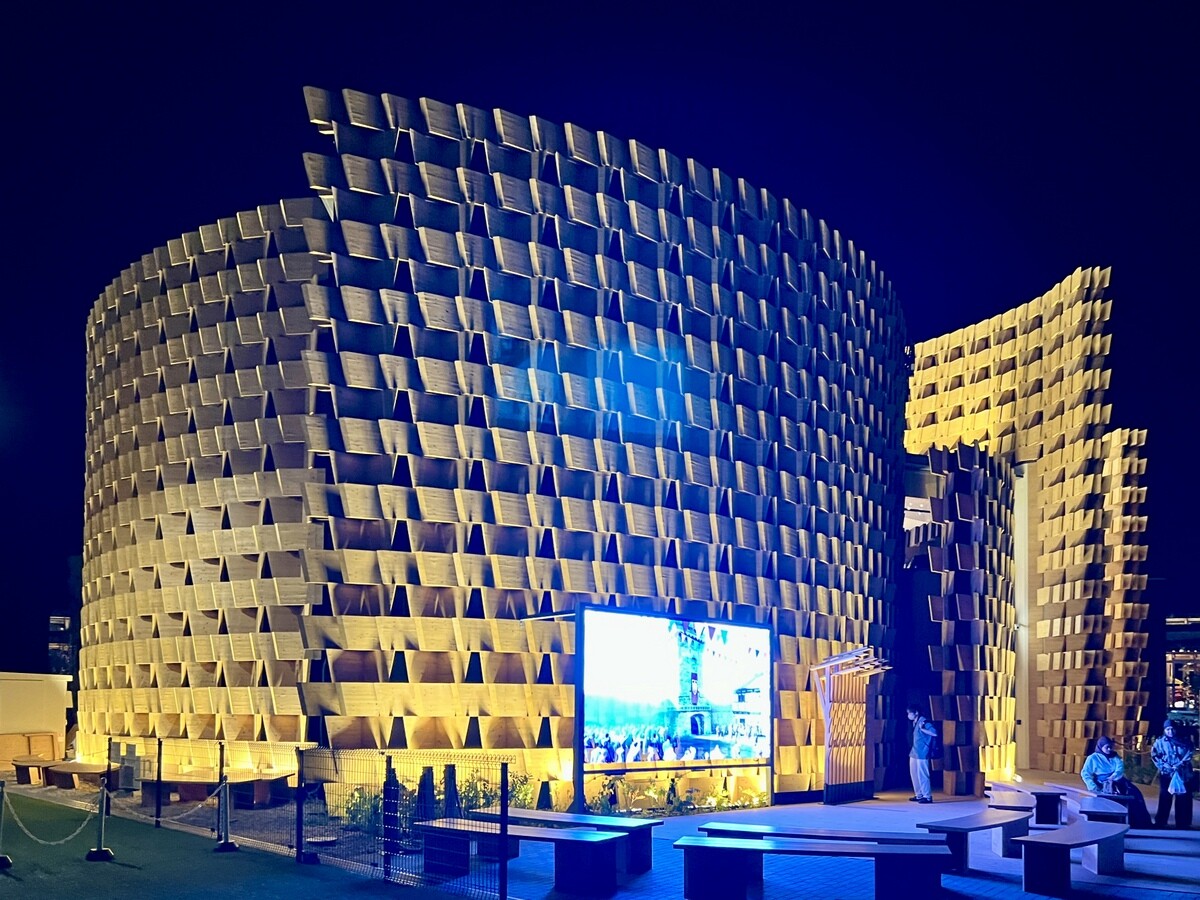 アトリエ・ブリュックナー Atelier Bruckner 設計。屋上には、大阪近郊のスギ材を使った高さ8メートルの彫刻群があり、その木材は会期後はウズベキスタンで再利用されるのだそう。