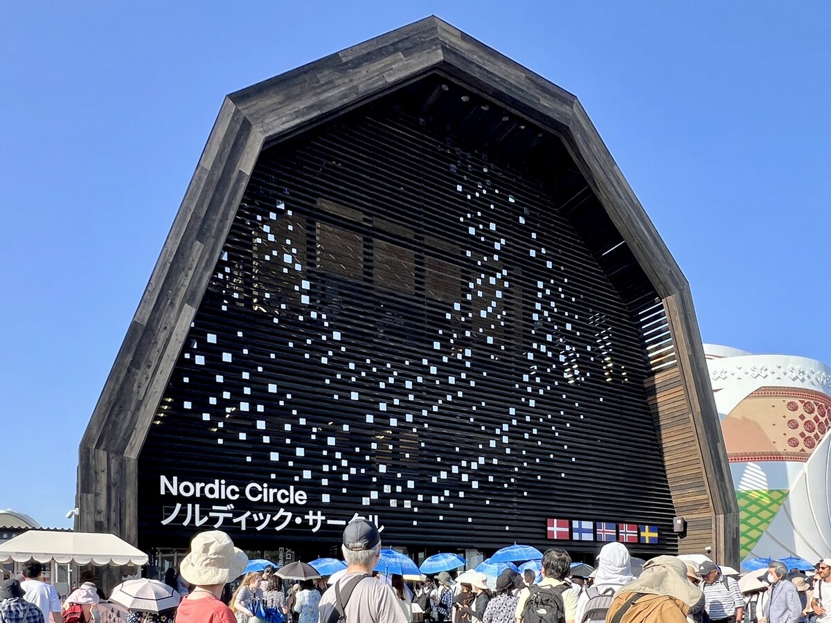 ミケーレ・デ・ルッキ Michele De Lucchi & AMDL Circle 設計。アイスランド、スウェーデン、デンマーク、ノルウェー、フィンランドの北欧5カ国の共同パビリオン。北欧の伝統的な納屋をイメージしており、外壁は日本のスギ材に柿渋と墨を混ぜたものが使われているのだそう。