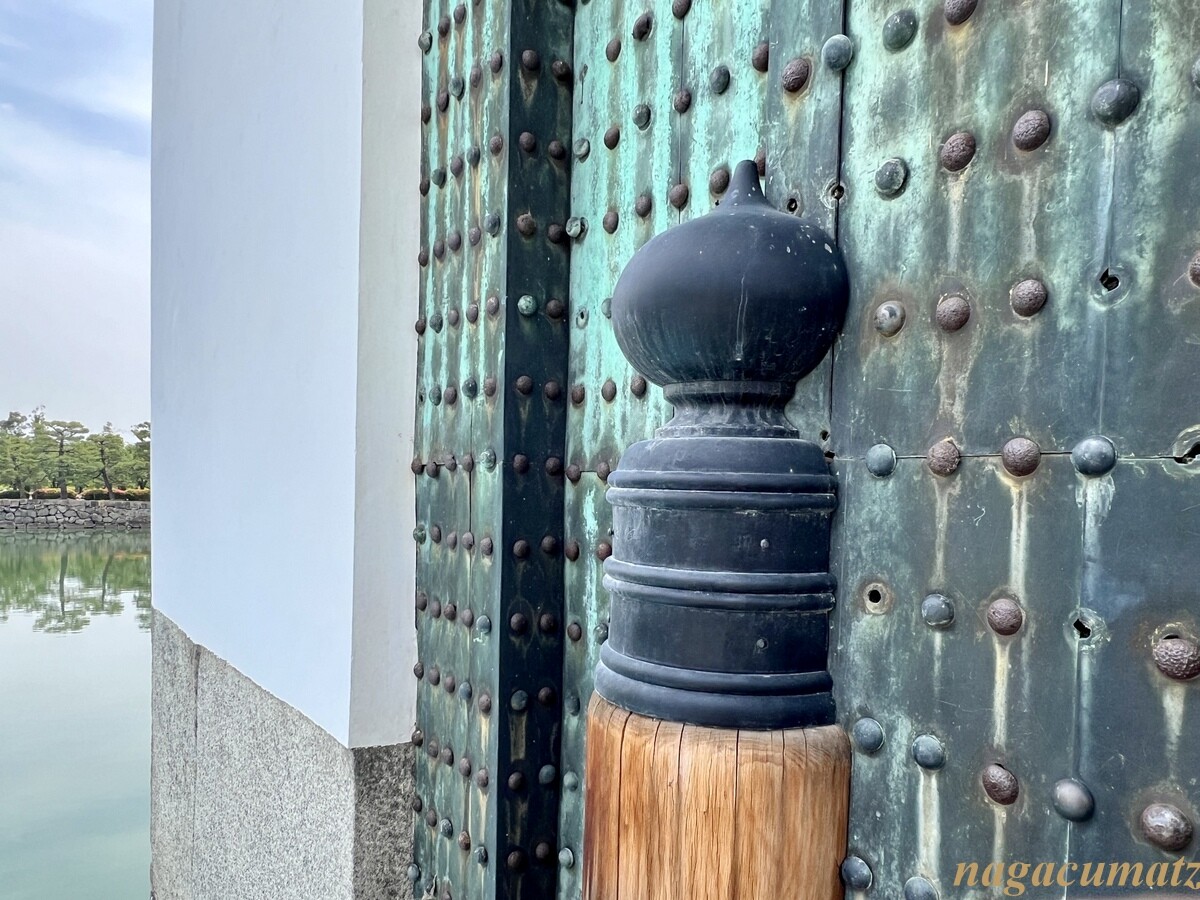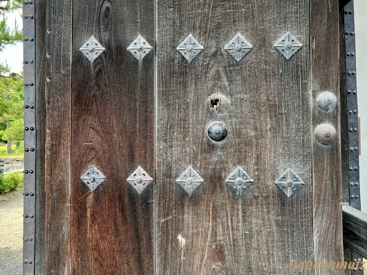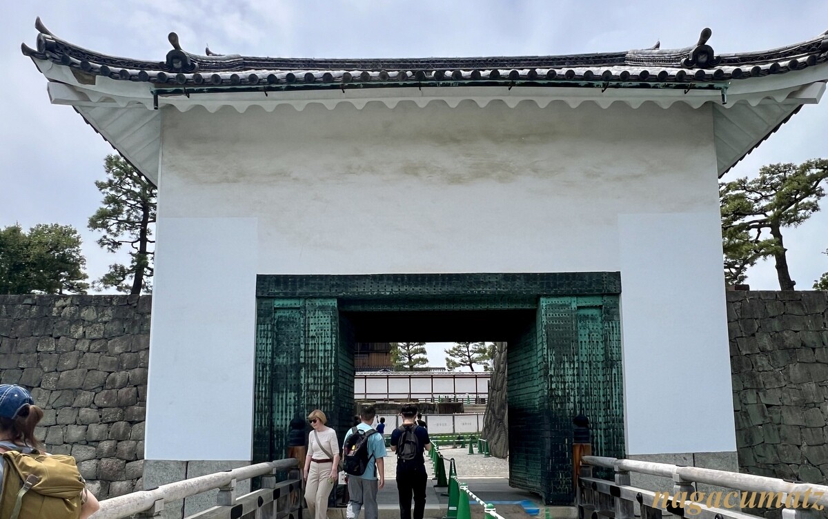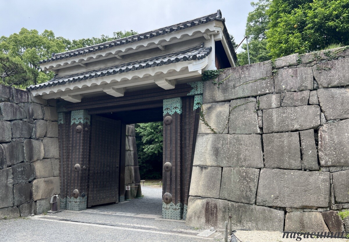 慶長8年(1603年)の築城時からこの場所にあるが、現在のものがその時のものか、寛永行幸時(1626年)に建て替えられたかは不明なのだそう。上述の東大手門より3間(6メートル)短く、一回り小さいが、奥行きや高さは同じで出格子窓に石落としも備えているのも同様。東大手門のような飾金物や金箔や座金は使っていない。