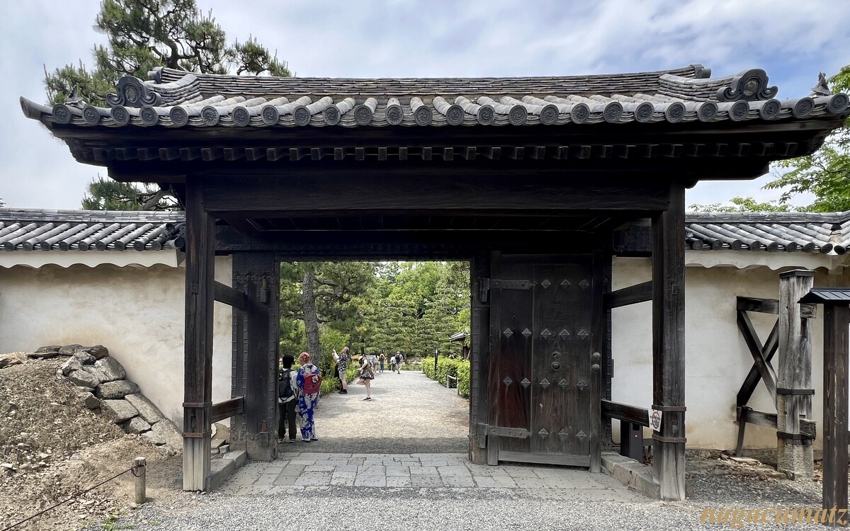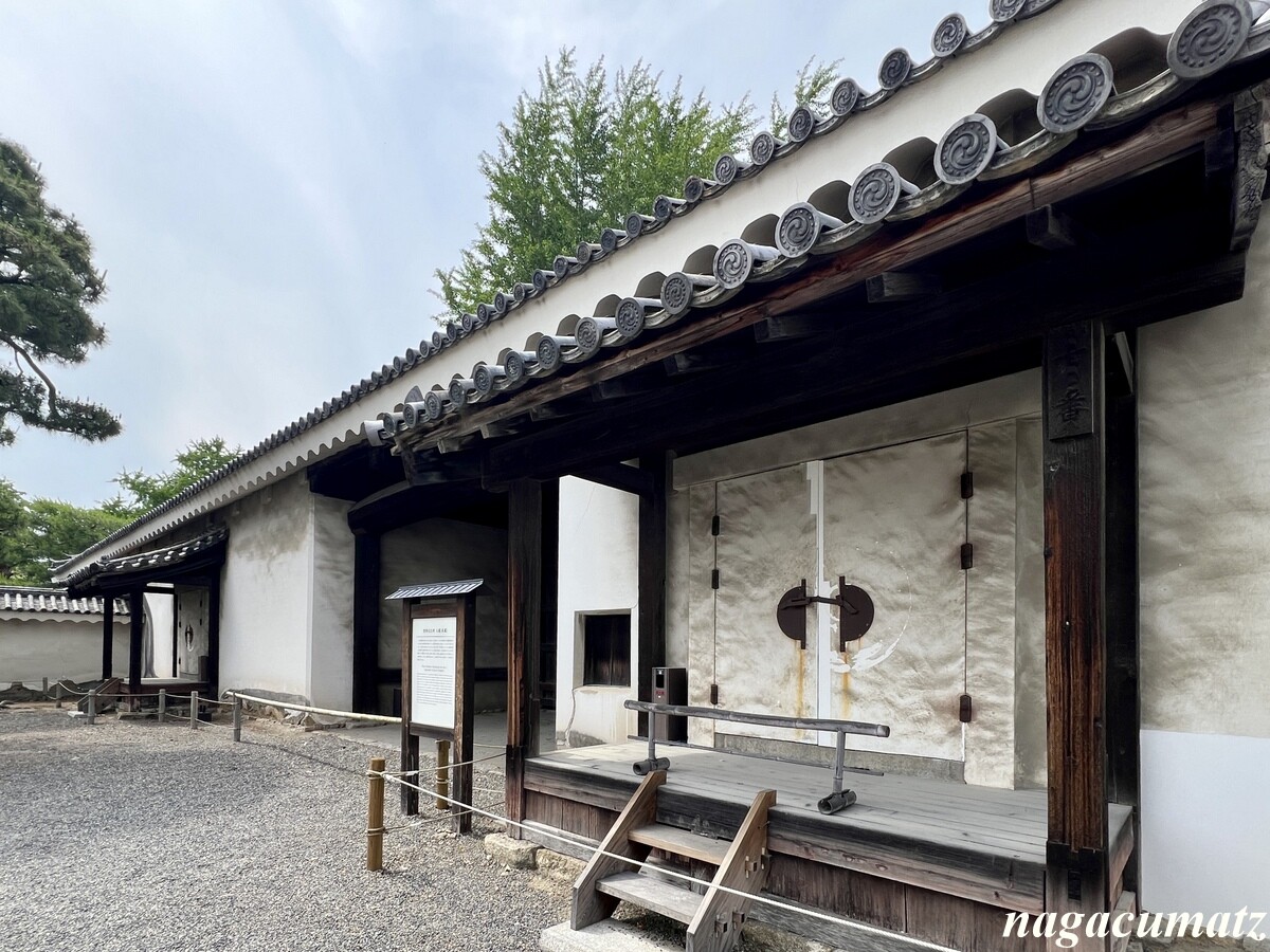 寛永3年(1626年)頃の建築。正面と背面に4本の控柱を立てた四脚門。四脚門がお城で使われることは少なく、二条城では唐門があるのみとのこと。