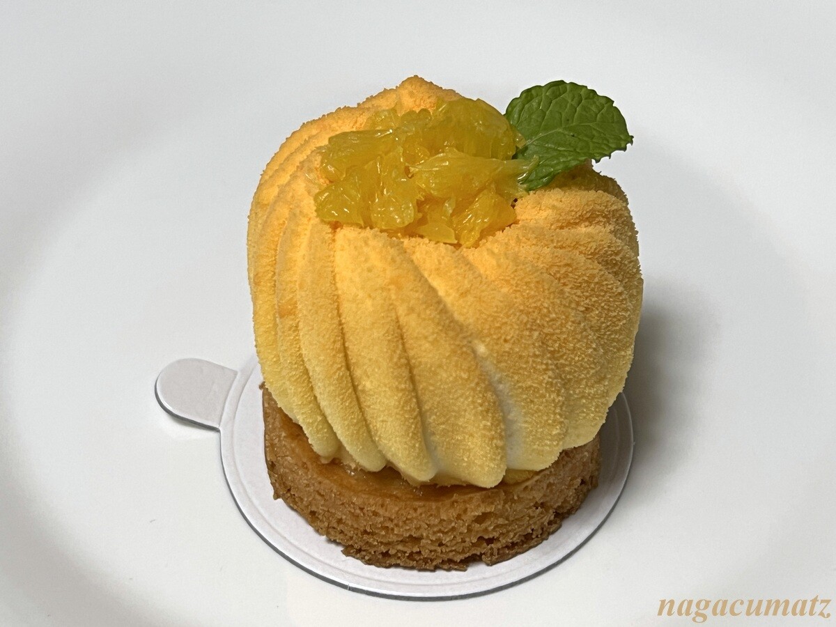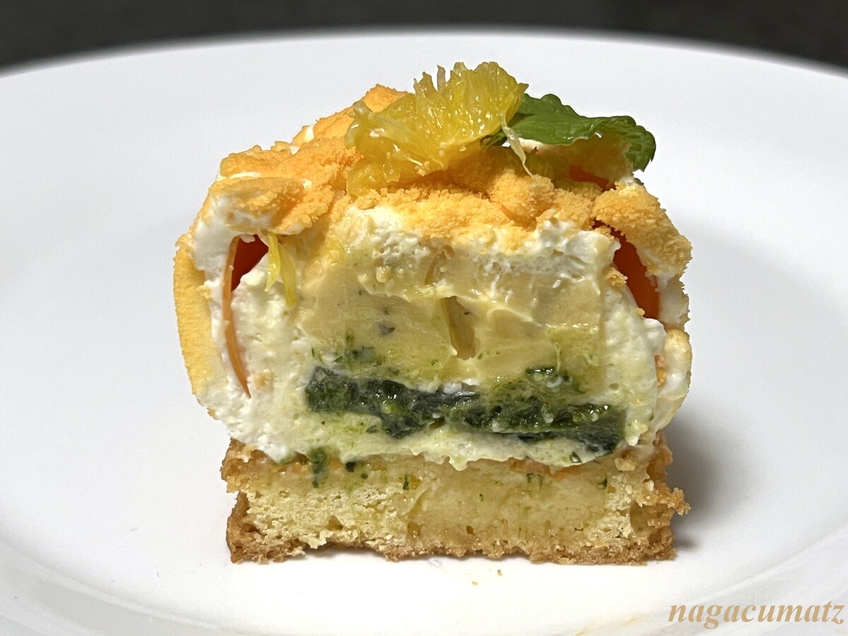 ホワイトチョコレートでコーティングされた外側の中には、オレンジとバジルのムースがあり、バジルの香りがしっかりしていていける。