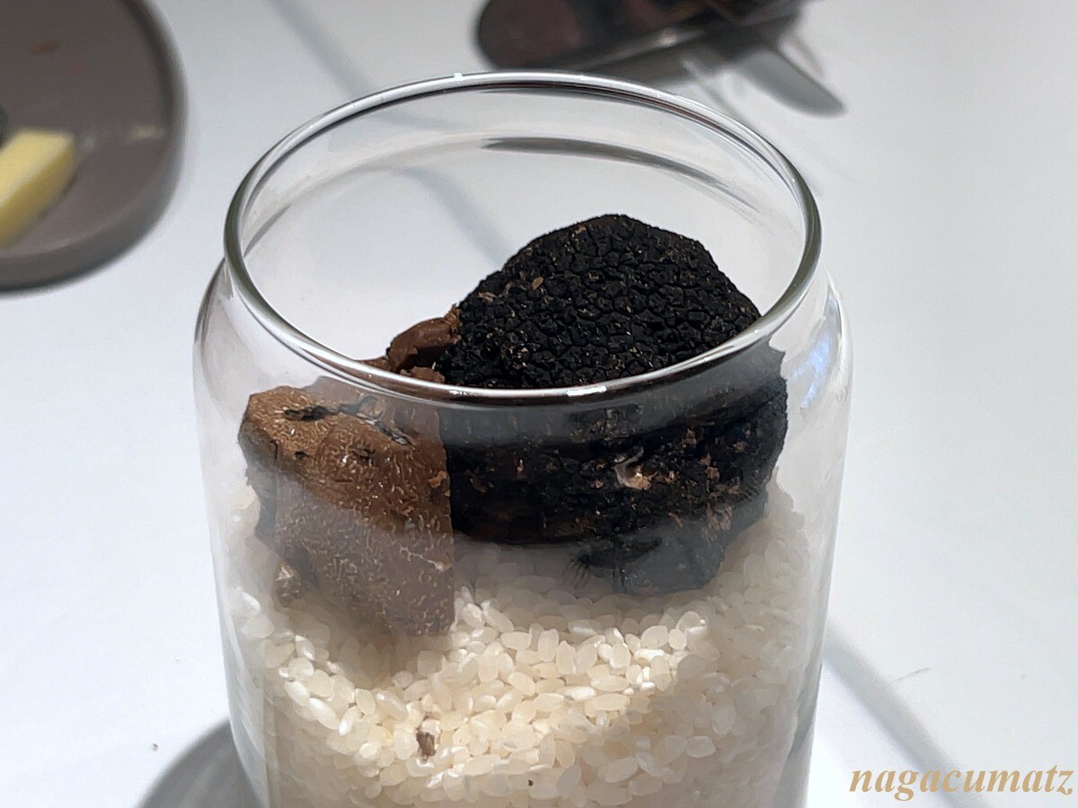 豚のソースはカシスソースと、奥には小松菜のソース。横にはツルムラサキやオニオン、茄子と挽肉などのムサカ、ぶどうの枝にさしたチョリソーが付く。どれも美味しいが、トリュフの香りはあまりせず💧