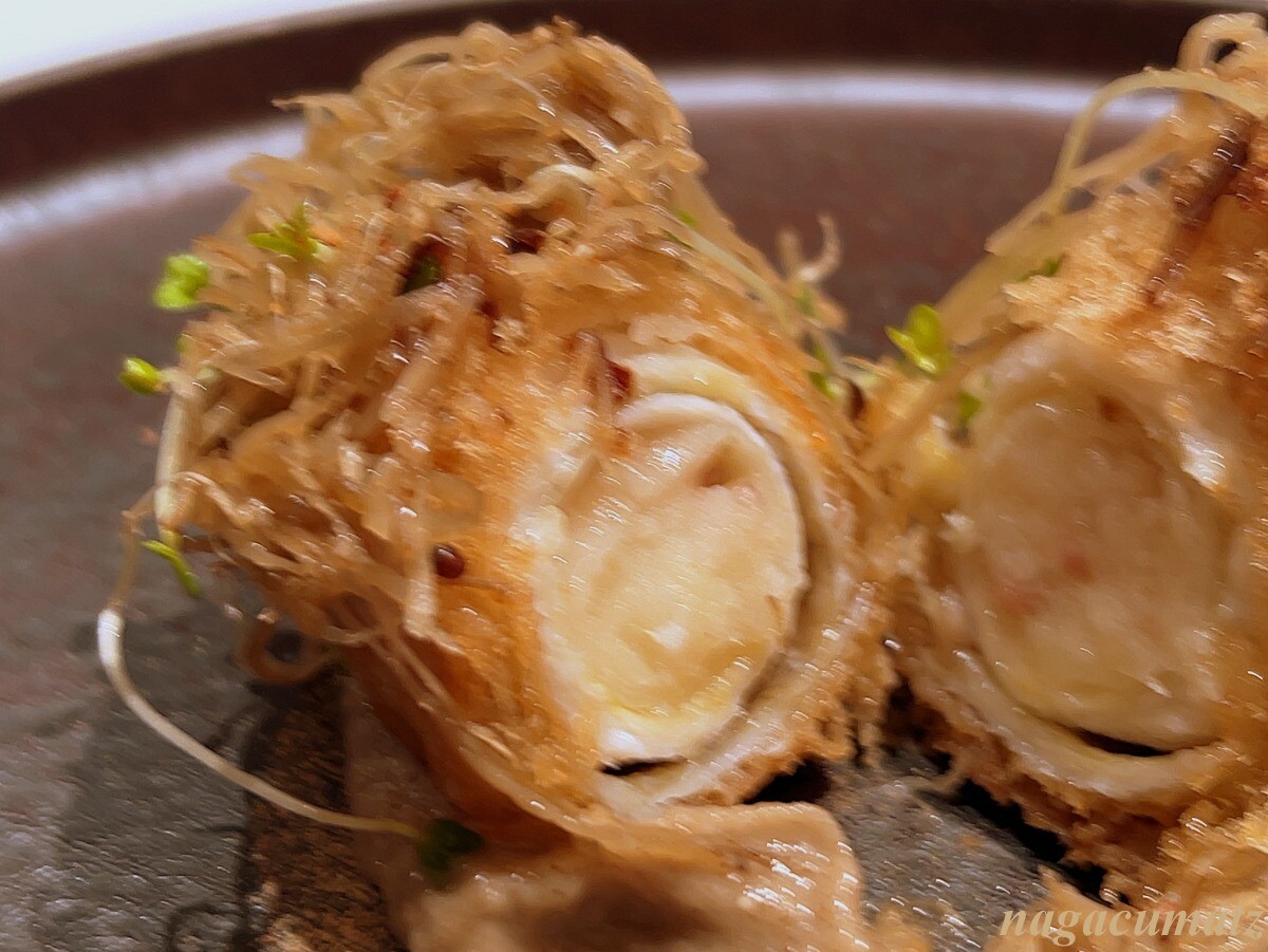 穴子のフリット 中には百合根とベーコンが入っており、周りはカダイフ、ソースには牛蒡。上には揚げた穴子の骨が載る。