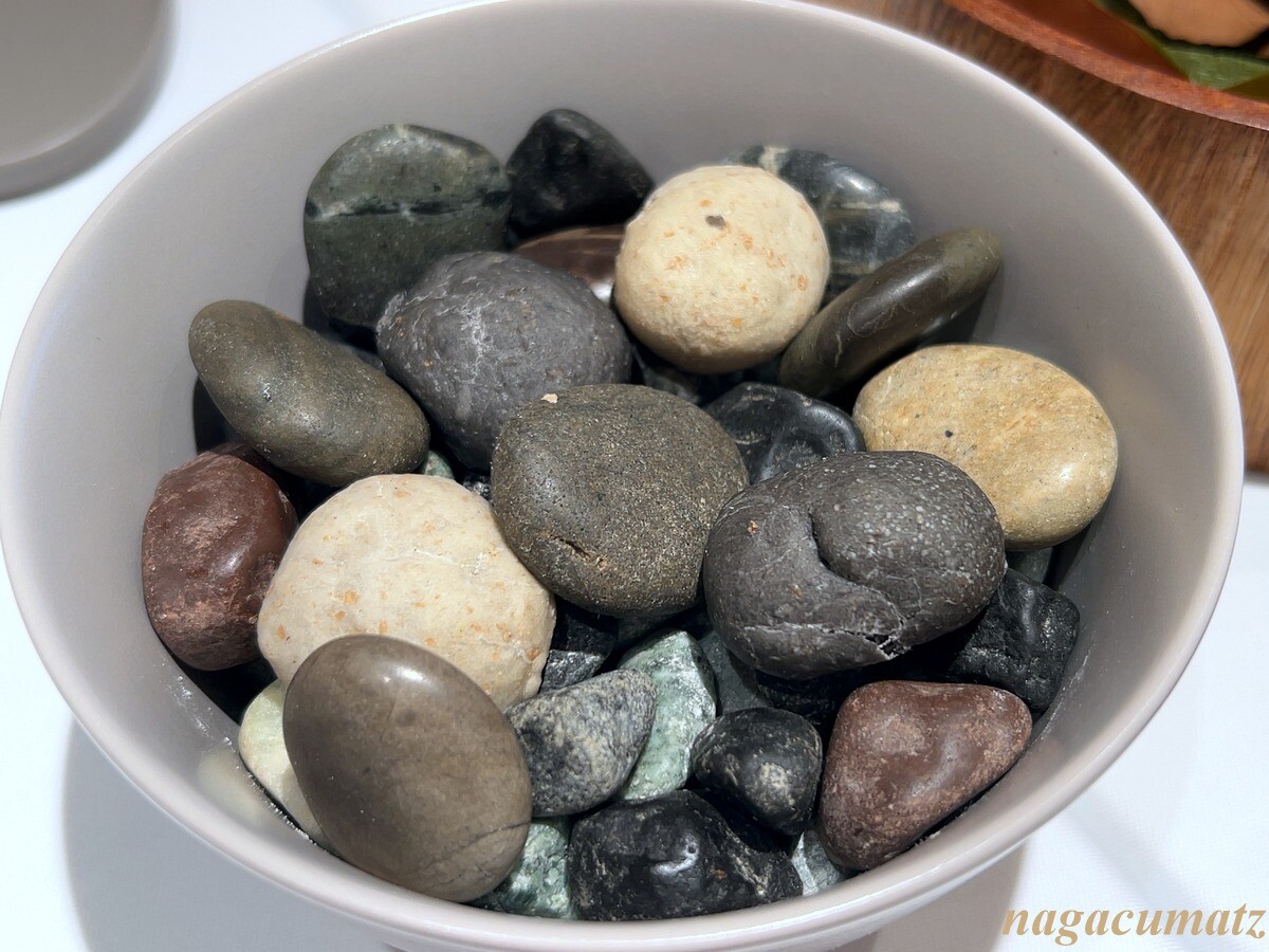 小石の中に、小石に見立てた白いパンと竹炭で黒くしたパンが。中にはリエットが入っている。