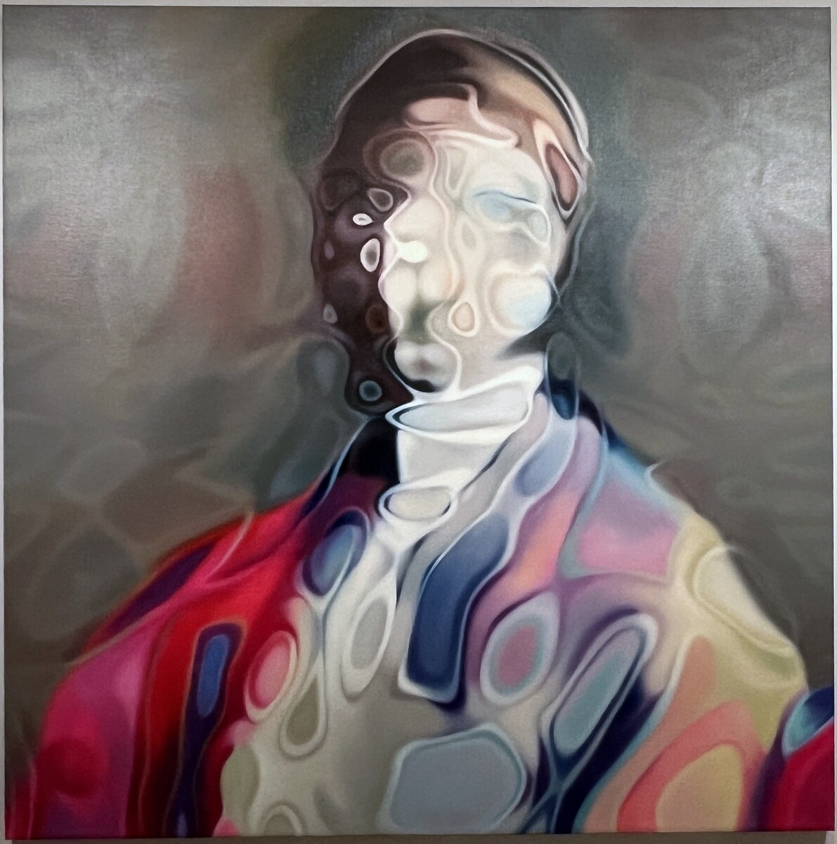 AI のディープラーニングのひとつである敵対的生成ネットワークを使い、既存の複数の肖像画から生成させる初期段階で止め、それを油彩画にしておられる。