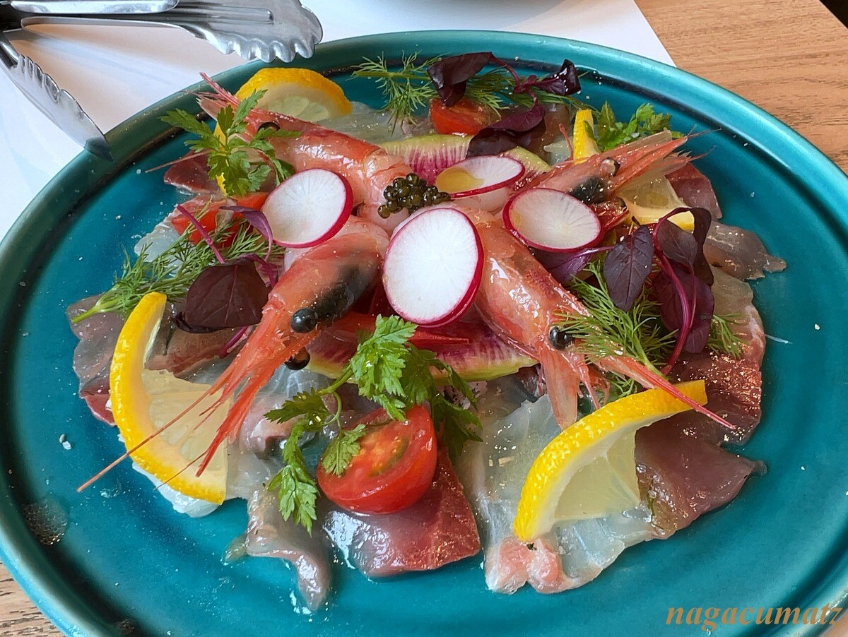 本日のカルパッチョ 2400円 ワラサ、鯛、甘海老に、紅芯大根やリーフものに、フェンネルなどの香草も載る。