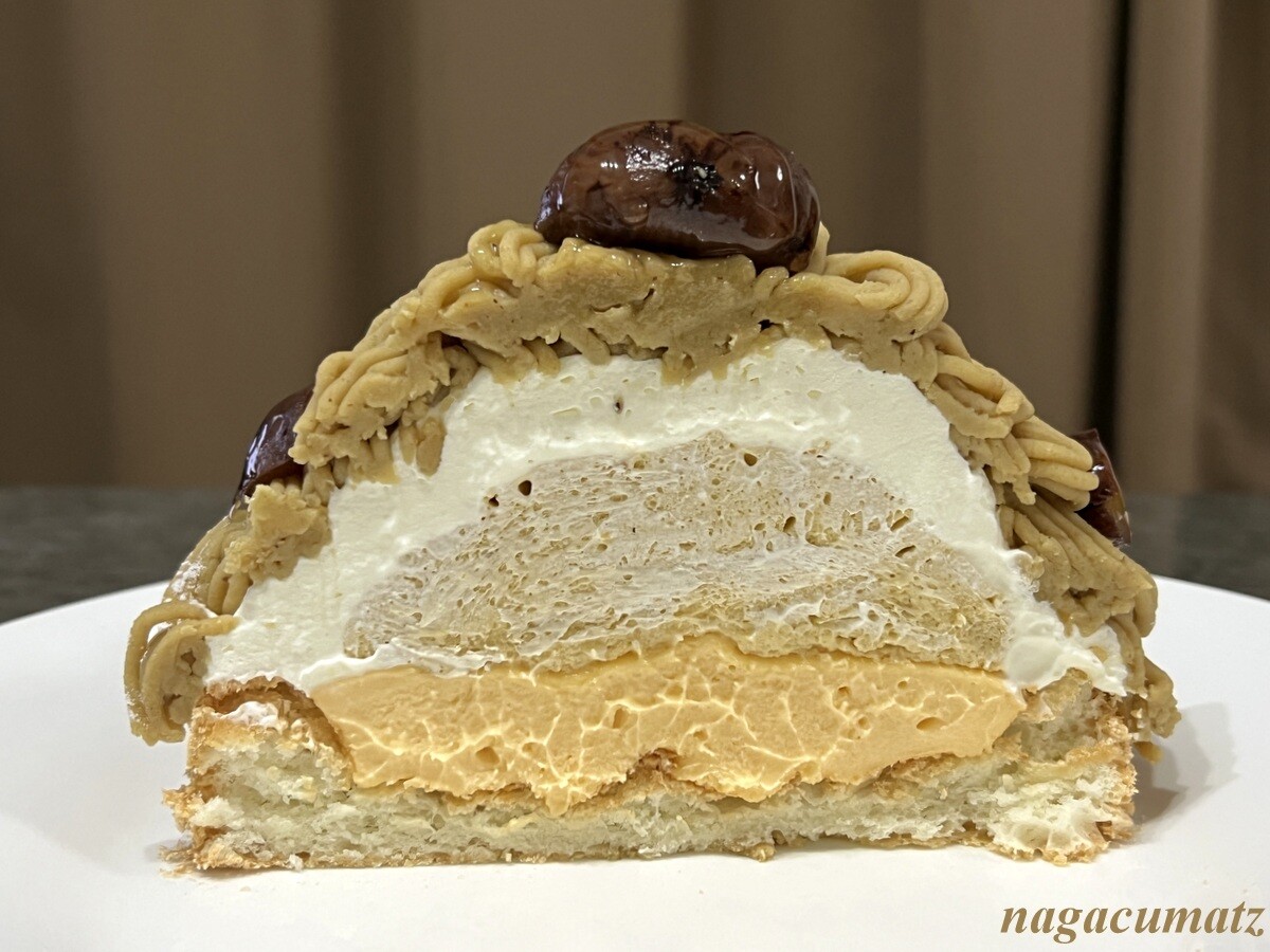 アーモンドベースの軽い生地の上に、ラム酒の効いたムースリーヌ、和栗のシブースト、生クリーム、和栗のペーストの4層となっているが、それぞれが非常に美味しく楽しめる。周りに散らしてある栗だけでも美味しい😂 大幅な値上げラッシュが当たり前となっている昨今、3年前から2割にも満たない値上げとなっているのも有り難い。
