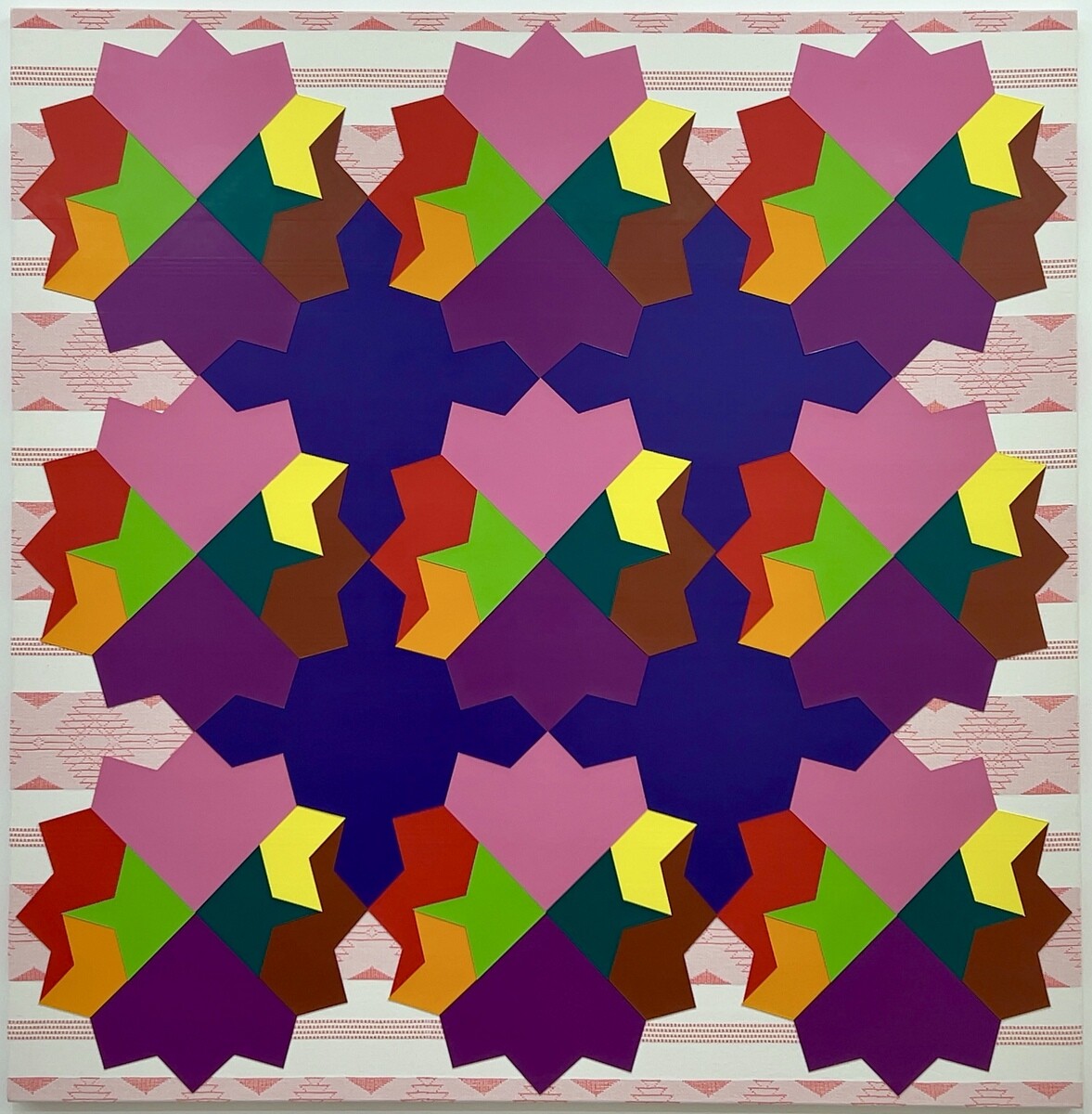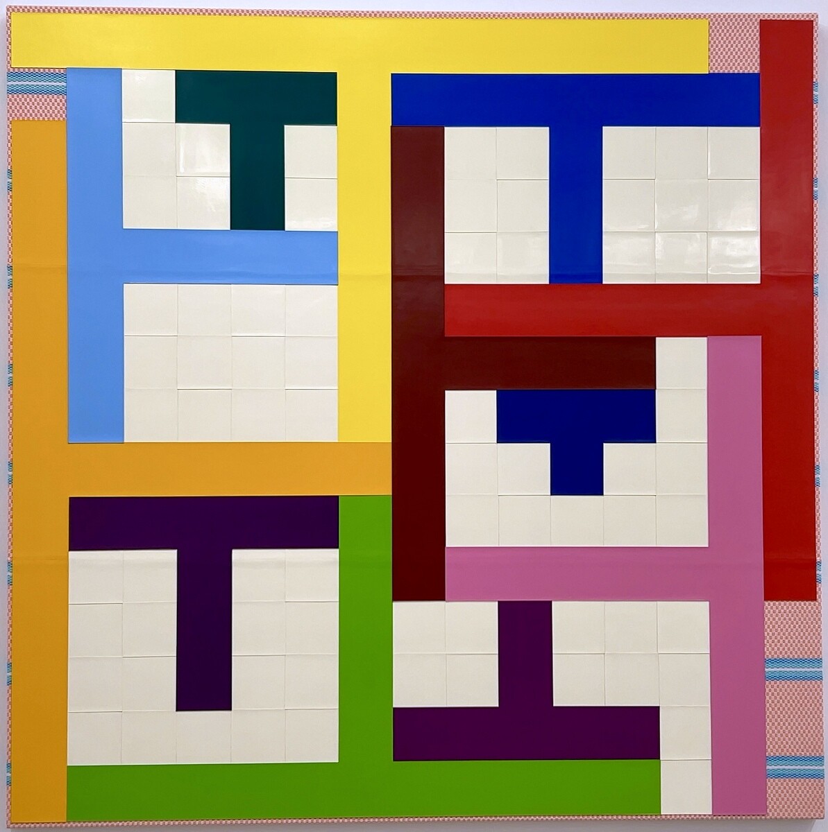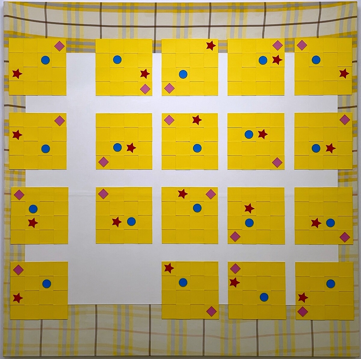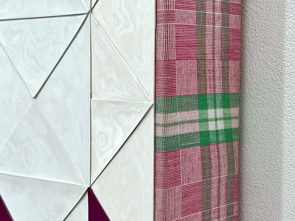 中国各地の織物市場や村々で地域独自のがらが入った織物を手縫いして作られたシーツが、キャンバスに貼られており、その上にマスキングテープなどを使ってアクリル絵の具を厚く塗り重ねて研磨して制作されているとのこと。