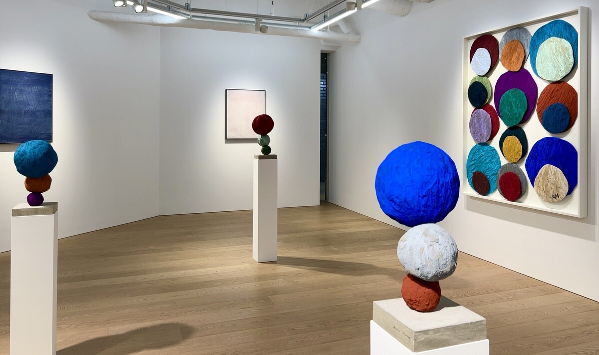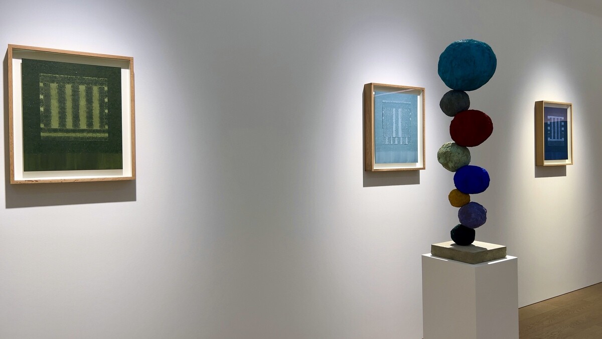 アニー・モリス Annie Morris 氏は、色彩豊かな球体が積み重なる彫刻「Stack」シリーズを、イドリス・カーン Idris Khan 氏は、青やグレーを基調とした作品を展開しており、デュオとしての共同制作や、二人展も開催し、公私ともにパートナーなのだそう。